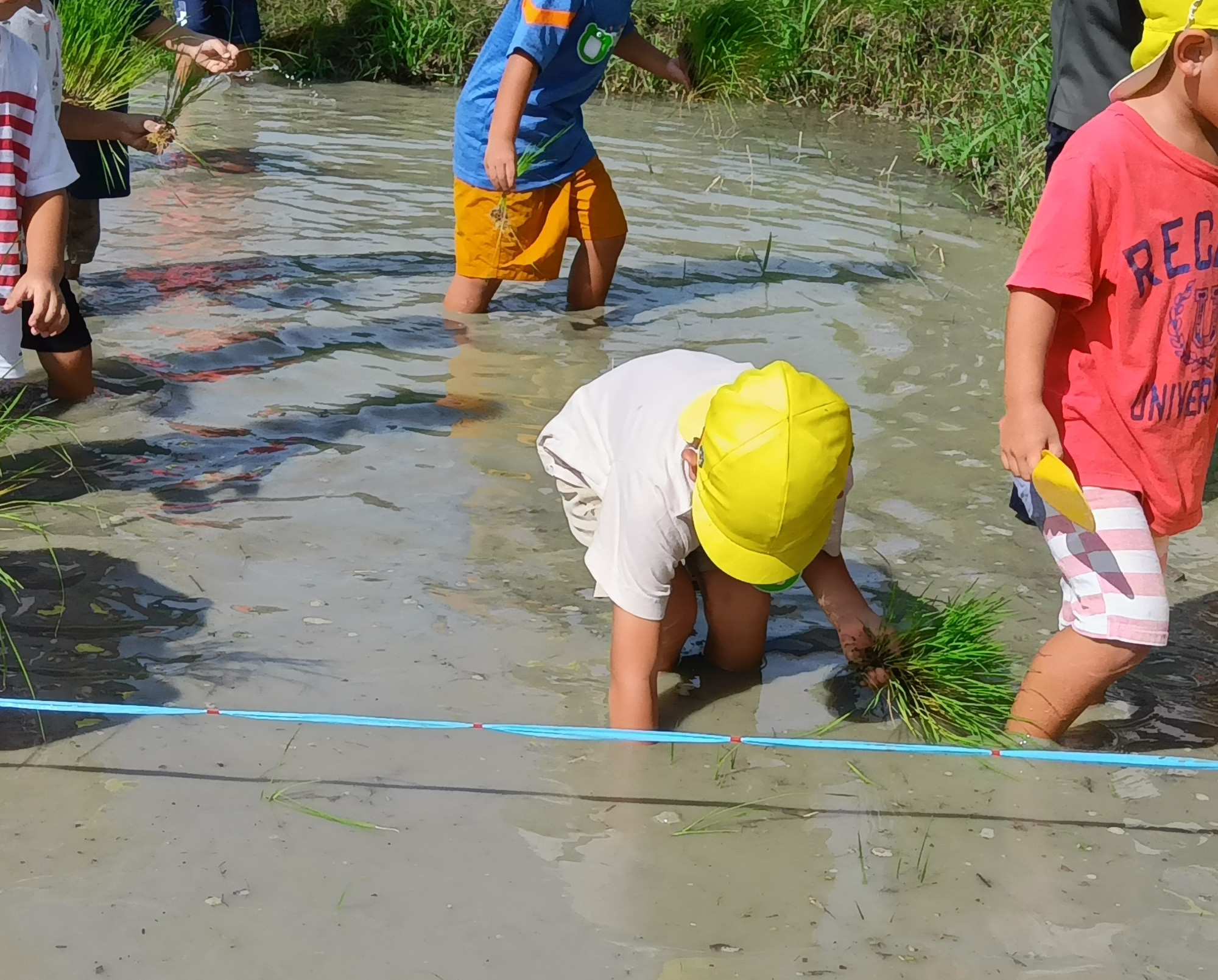 9月に入り、秋の訪れを感じるかと思えば、夏の暑さが続く沖縄です。強い日差しや熱中症警戒アラートがまだまだ続いています。そんな中でも、発達支援つむぎ 前原ルームでは前原どろんこ保育園と合同で田植えを行いました。なんと田んぼは園庭の一角にあるのです。子どもたちは興味津々で「ぼくも植えたい!」と意気込む子もいれば、「私は見ているだけでいい」と棚田上から見学を希望する子もいました。