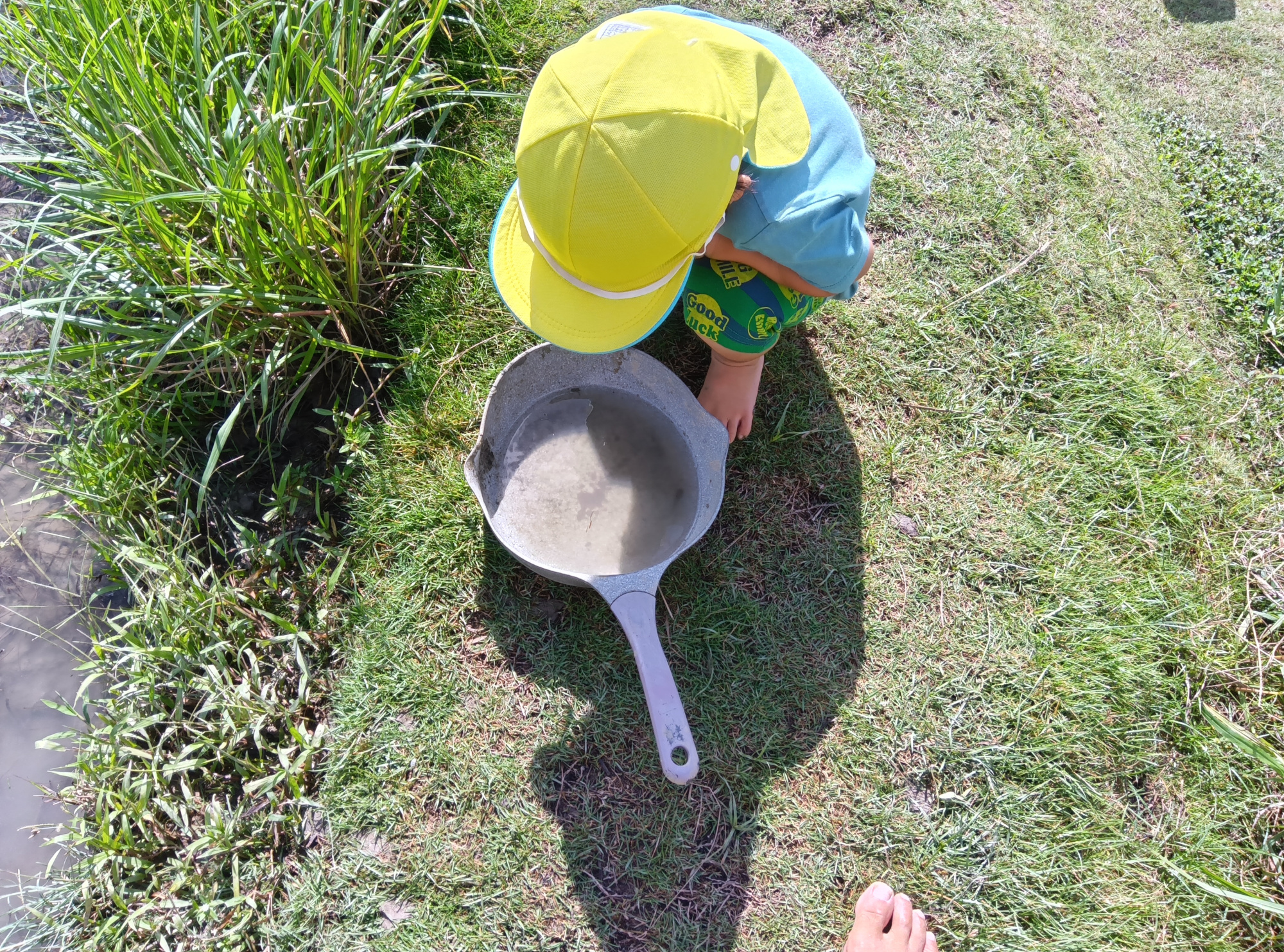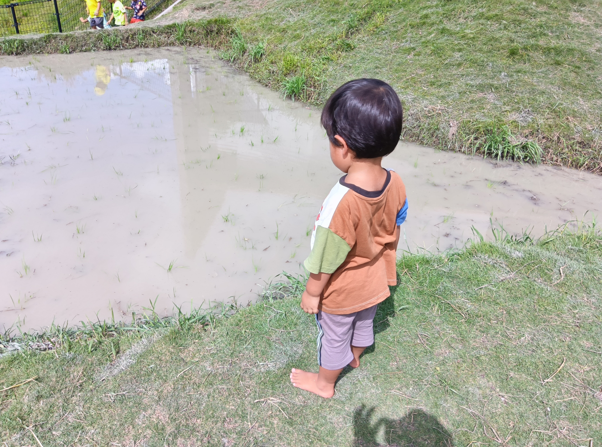 2週間経つと棚田に生き物が出現しました。オタマジャクシを見つけた子どもたちは大興奮し、つむぎの子はそれを見て「自分も」とジェスチャーで知らせてくれました。近くで観察した後、自らオタマジャクシに手をのばし大興奮です。