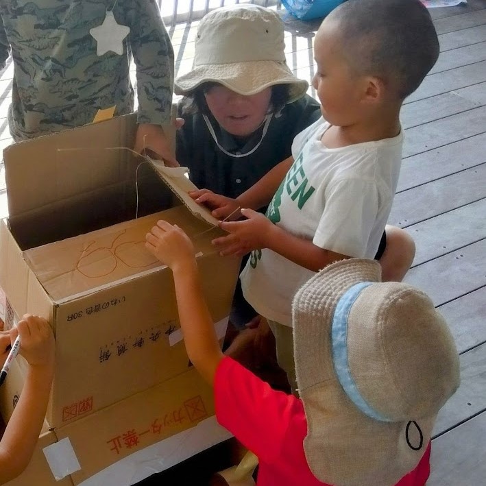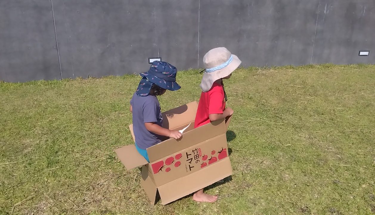 屋上園庭での戸外活動。2人は段ボールを使って遊び始めました。段ボールを電車に見立てたごっこ遊びかと思いきや、1人の子がそれに「獅子舞」と名付けたのです。
