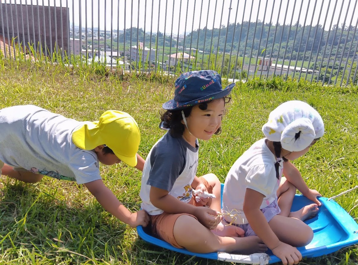 また、ある子が「これー。これー」と指を差した先には、芝生園庭をソリでめいっぱい駆け回る保育園の友達の姿でした。