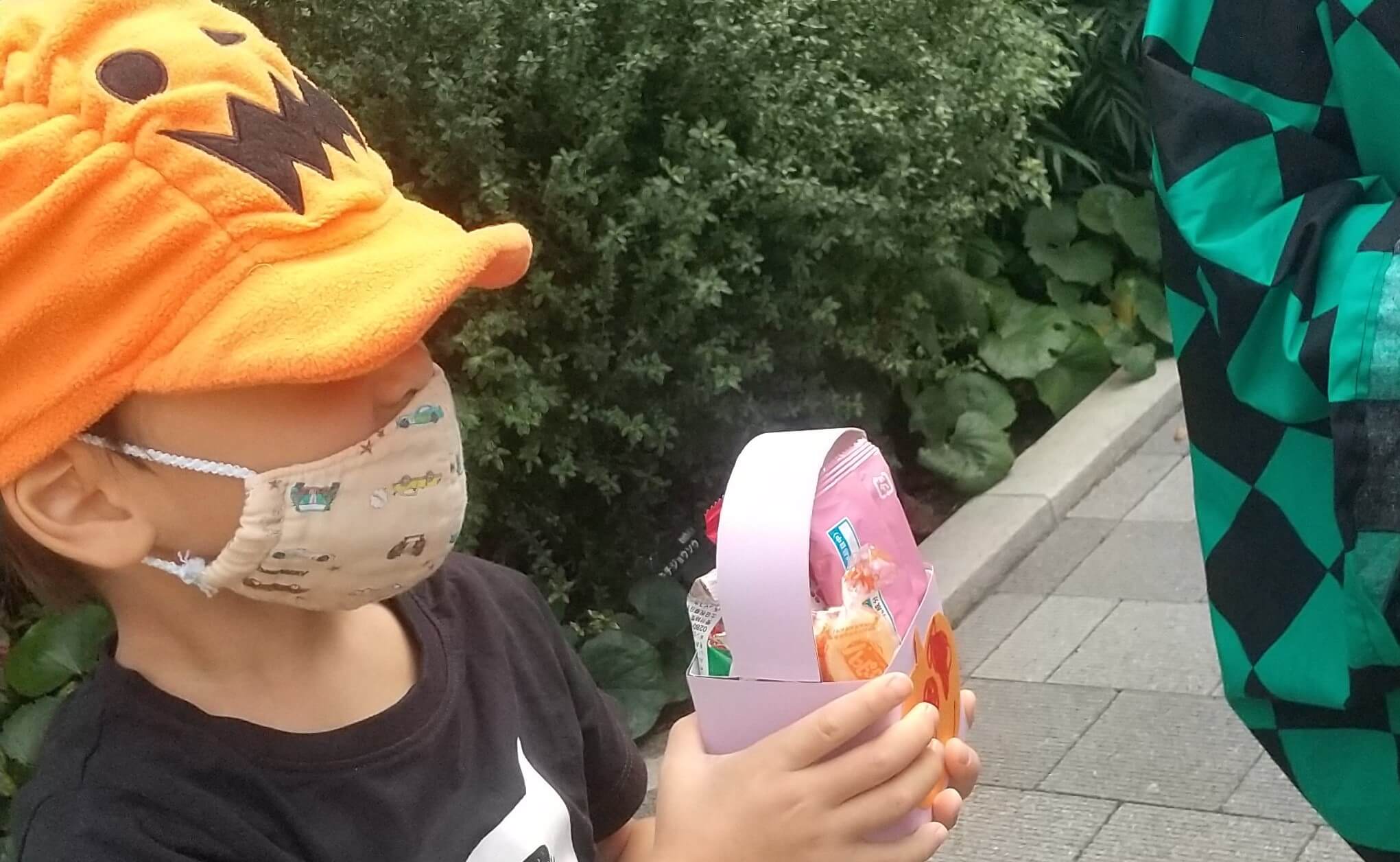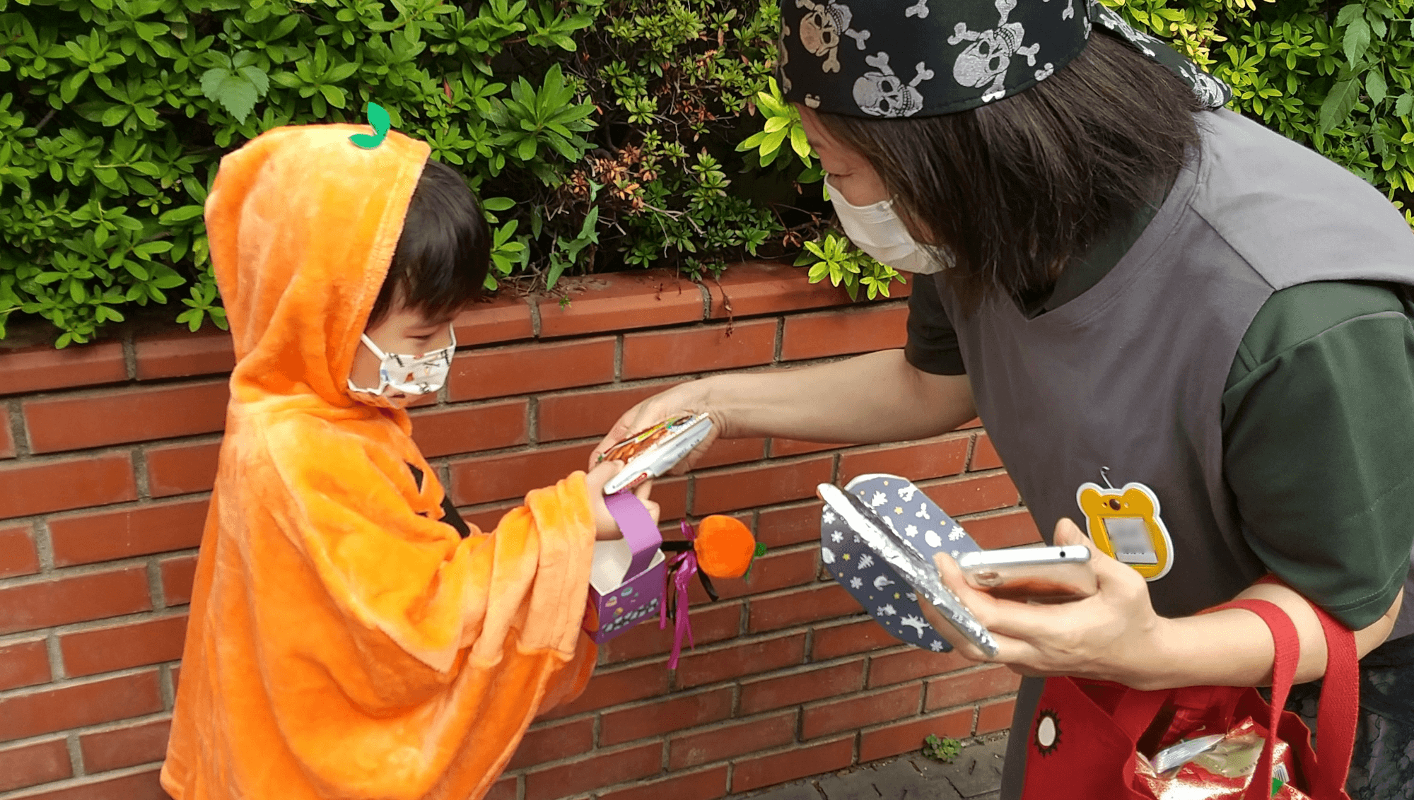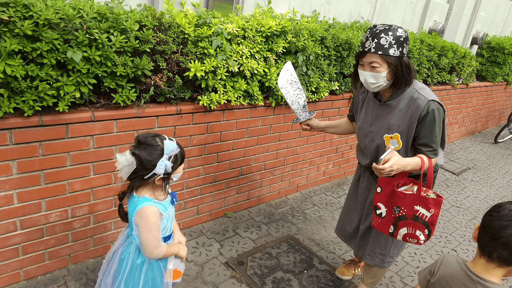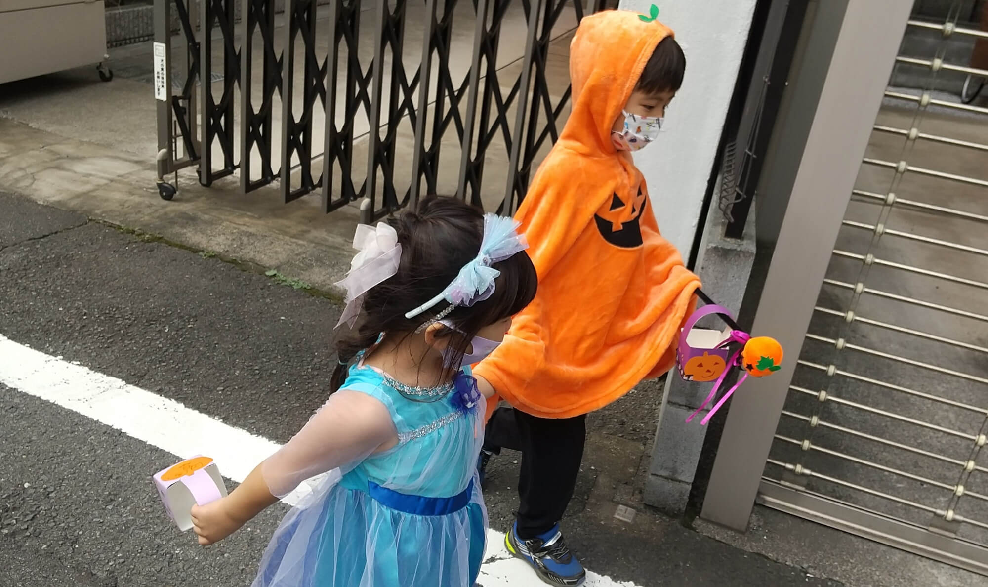 思い思いの仮装をして、少し遠い公園まで歩きます。はじめましてのお友だちにはちょっとドキドキ。一緒に頑張って歩きましょう。