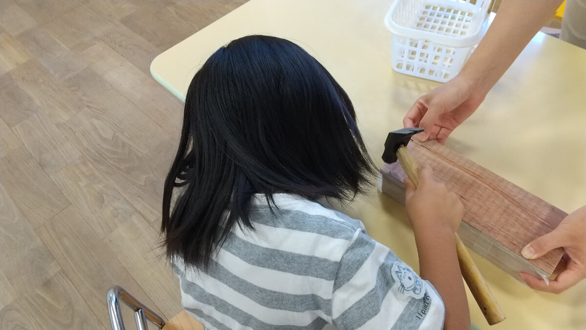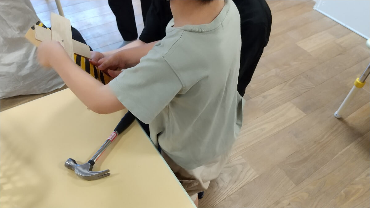 釘を真っすぐに打つのは至難の業ですが、普段触れることのない工具に子どもは興味津々です。新しい事や大きな音が苦手だったり、自信がなかったりする子どもたちも、積極的に挑戦することができました。
