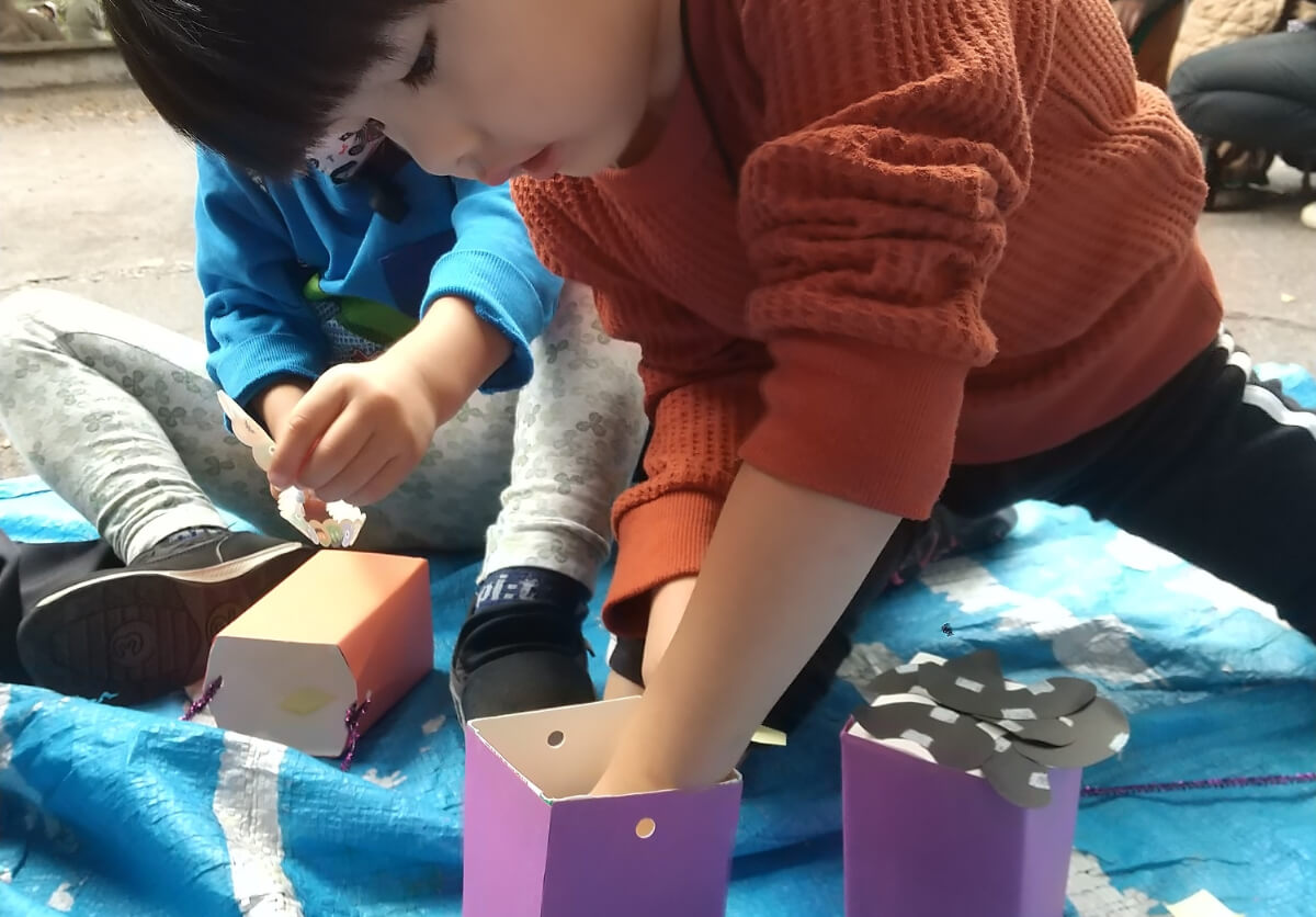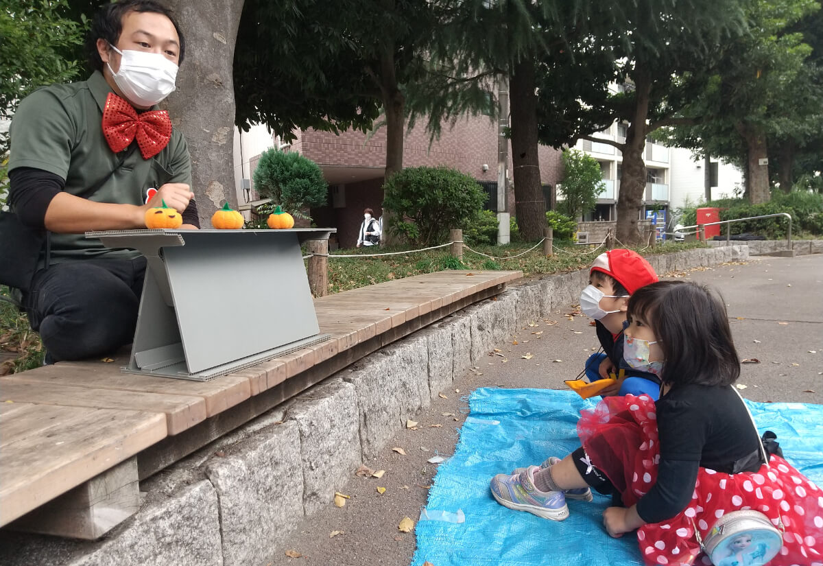 出発前に公園では、かぼちゃの人形が隠れて踊って楽しませてくれる「かぼちゃ劇場」と、「工作活動」を行いました。つむぎの子どもたちは、この時期になると登場するかぼちゃたちが大好きです。興味をもって近くへ見に来てくれる地域の子どももいました。