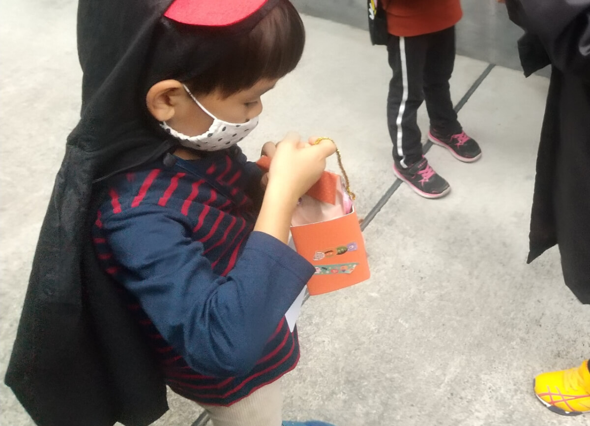 そう、お菓子です。子どもにとっては、やっぱりお菓子があってのハロウィンですね。地域の人やスタッフから、みんなにこにこ顔で受け取り、作ったばかりのバッグへ大切にしまいました。