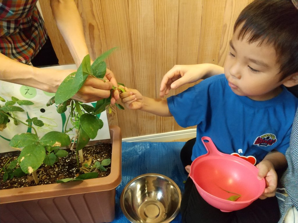 4月に子どもたちが植え、水をあげて育てた作物の一つである、枝豆が膨らみ食べごろとなり、実際に食べてみることになりました。つむぎ目白ルームでは、普段食べている野菜がどんな風にできるのか興味関心を持ってもらうことや、毎回水をあげてお世話をする経験を通して作物を作ることの難しさや愛着心を育むこと、友だちと一緒に期待感を持つことや収穫の喜びを分かちあうことなどをねらいとして、毎年野菜作りを行っています。実際に生えている枝豆を見たことのない子どもたちも多く、悪戦苦闘しながら収穫した後、お湯で茹でました。