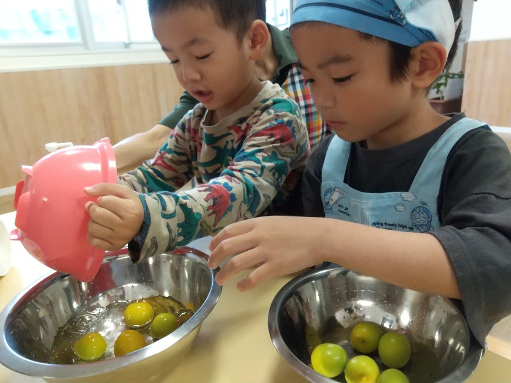 梅仕事は、季節感じながら共同作業を行うとっても大事な仕事です。今年も「梅シロップ」「梅干し」を作ります。初めて梅に触る子どももいれば、なんと今年で3回目という梅仕事のプロもいました。初めて梅の実を見る子どもたちは興味津々、以前に行った子どもたちは慣れた手つきで梅仕事に取り組んでいました。梅ジュースができるまで約2週間。梅干しが出来るまで約1か月。つむぎに来るたびにジブンたちで作った梅ジュースの瓶を見たり、梅干しの重りを確認したり出来上がりを楽しみにしています。