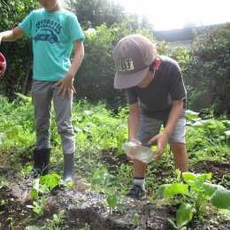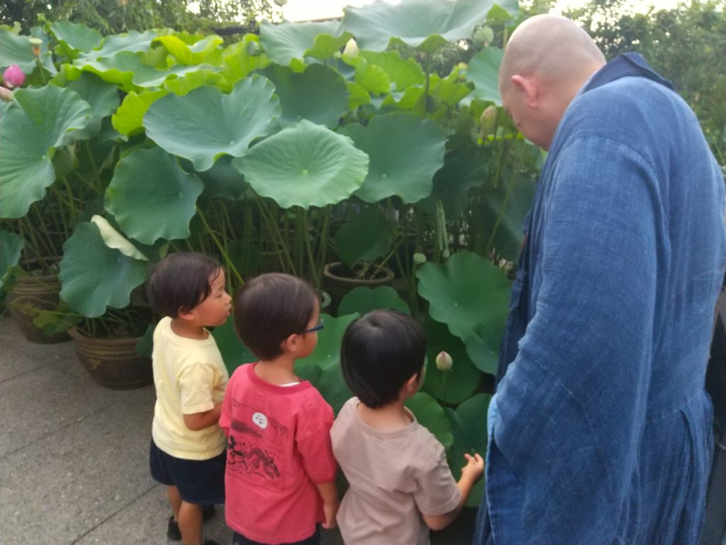 座禅が終わった後は、寺の庭を見せていただきました。大きな鉢に蓮があり、大きな葉や水から生えていることにも驚いていました。住職に「これは何?」と質問したり、「ここに蛙がいたんだよ」と教えてもらうと一生懸命探したりしていました。
