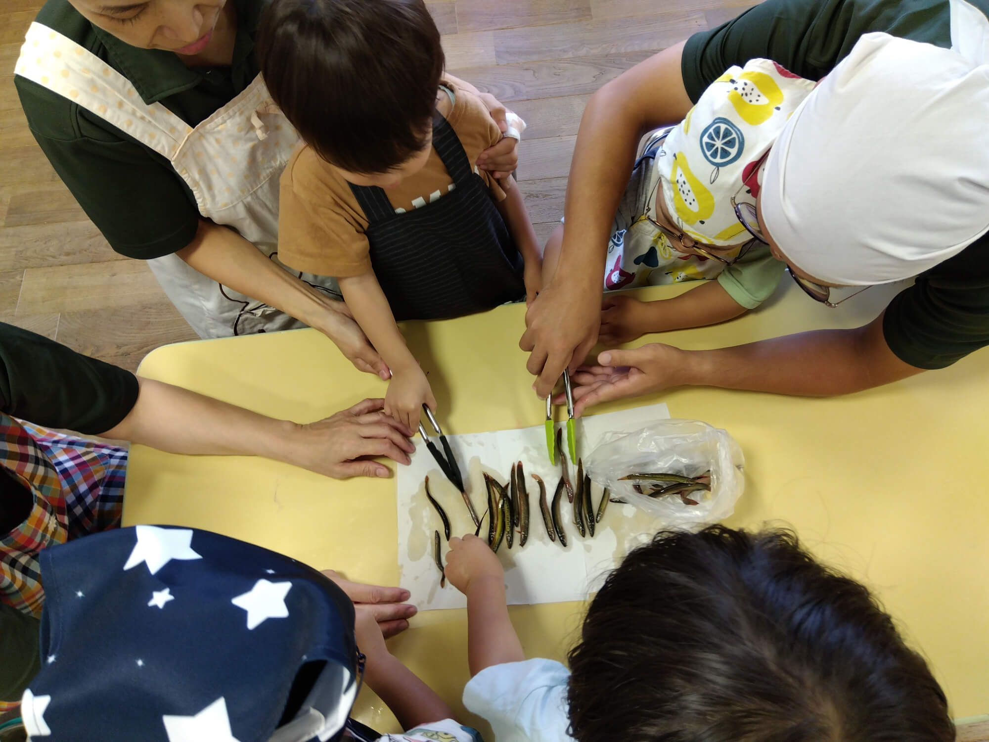 一つ目、「ドジョウのつかみ取り」です。ドジョウを捕まえる前にまず、室内で「ドジョウを捕まえて焼いて食べる」ということを写真を見せながら説明します。普段触れることの少ないどじょうに「よくわからない」という表情の子や、写真を見ただけで「食べないよ」と宣言する子もいました。