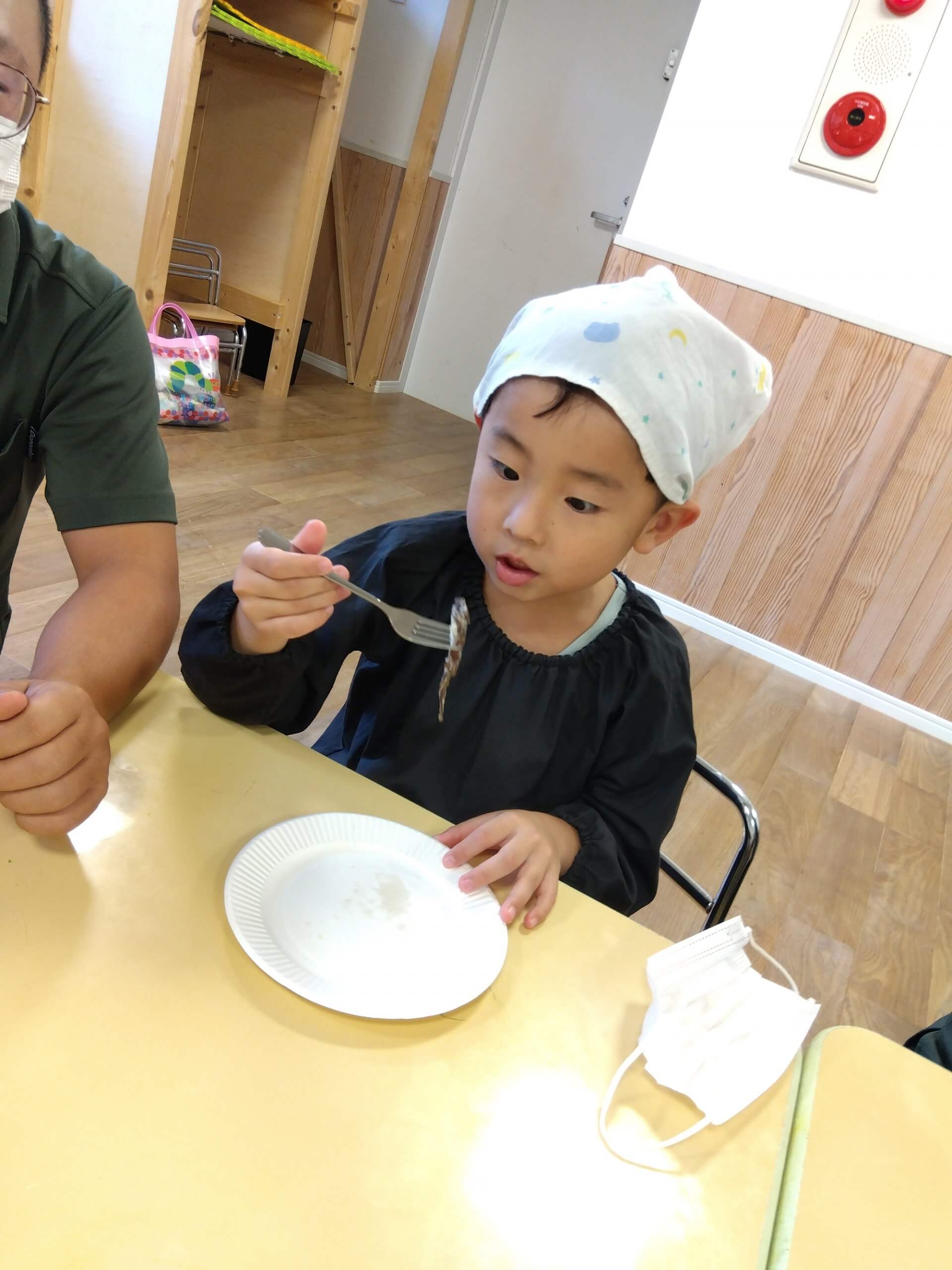 カレーが出来上がったら、ジブンで食べる分はジブンで配膳します。配膳が終わったら、さっそく食べてみます。ジブンで作ったカレーだからでしょうか、お代わりをしたり保護者に渡したり、多めに作ったカレーはすっかりなくなってしまいました。