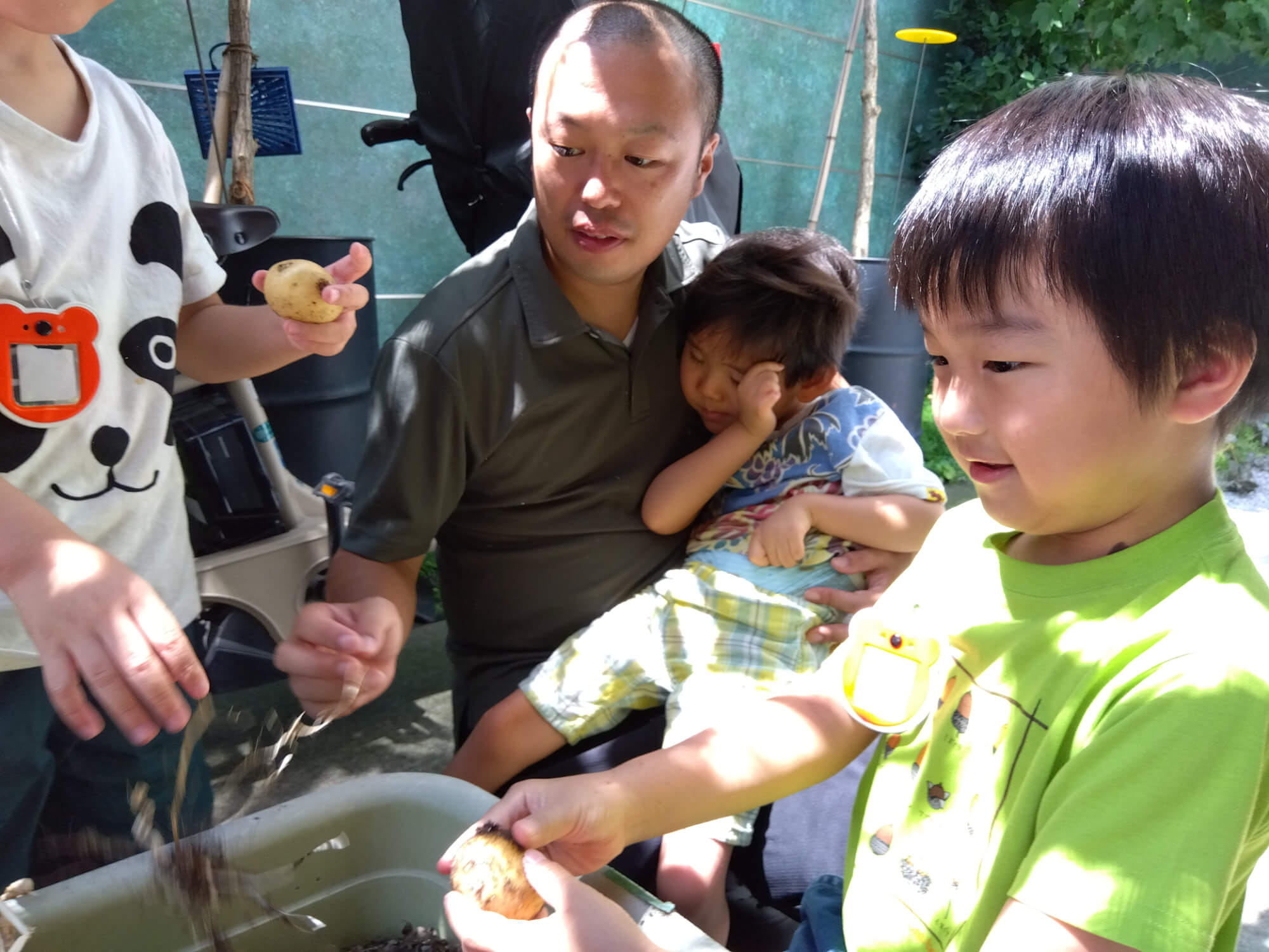 まずは収穫から行います。収穫できた作物は「人参」「ジャガイモ」「オクラ」「ナス」です。思った通りに収穫できた作物もあれば小さな作物もありましたが、収穫できた野菜を喜んでいました。