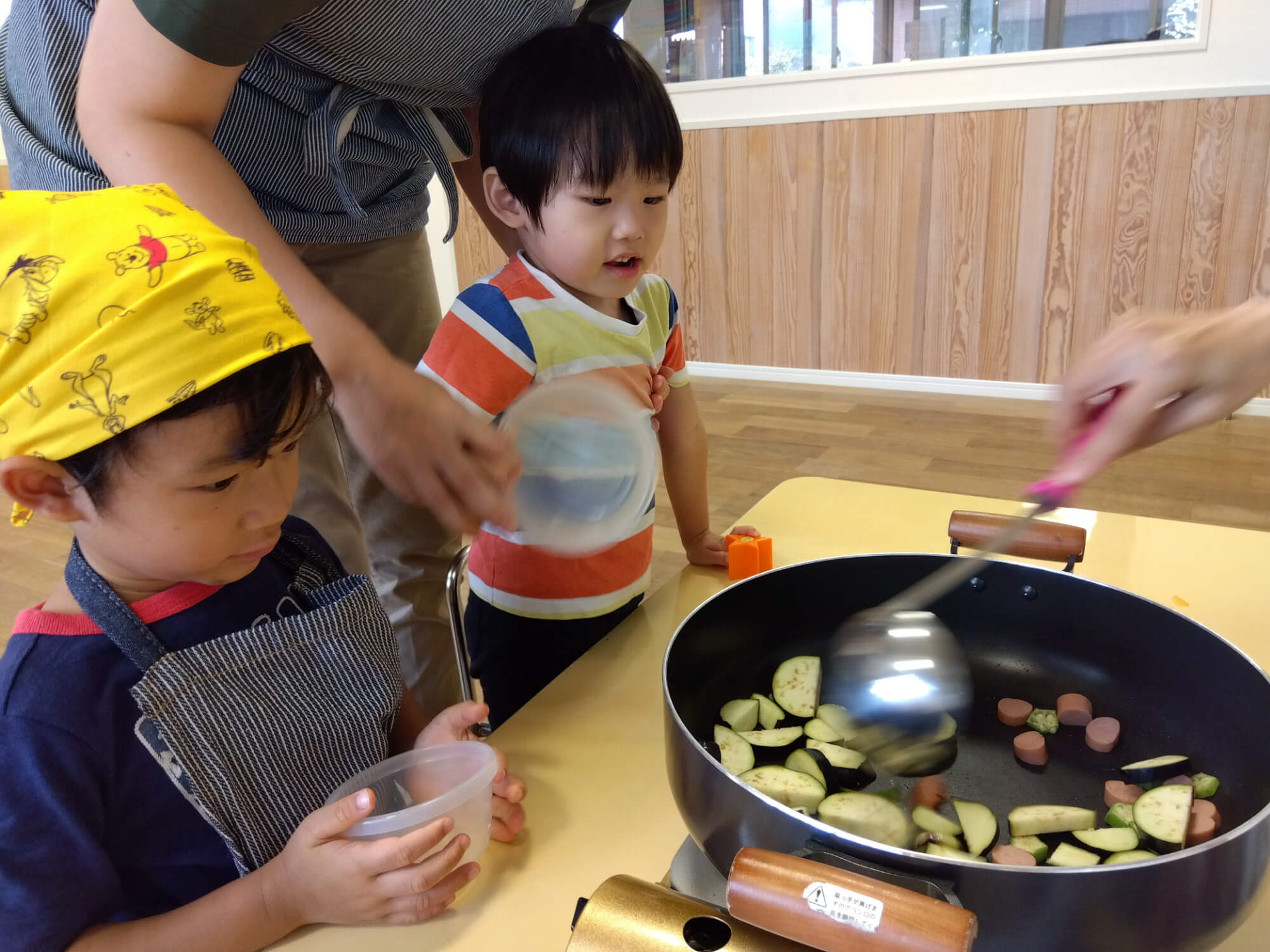 収穫が終わったら、調理を始めます。子どもたちはジブンたちで役割分担をして野菜を切っていきます。初めて包丁などの調理器具を使う子もいましたが、年長児がお手本になってくれました。カレーを作っている間が待ちきれないのかお鍋に近づき覗き込む様子も見られました。カレーのおいしい匂いが部屋に漂ってくると、「おいしそう!」「早く食べたい!」と待ちきれない様子です。