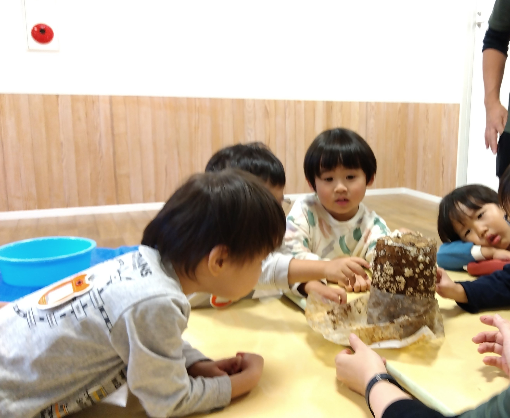 とりあえず、まずは見てみるところから始めようと、どんなふうに育てるかを説明します。そして、しいたけの苗床を目の前に置いてみると、想像していたものと違ったものが出てきたためか、子どもたちは真剣な表情に変わり熱心に苗床を見ています。