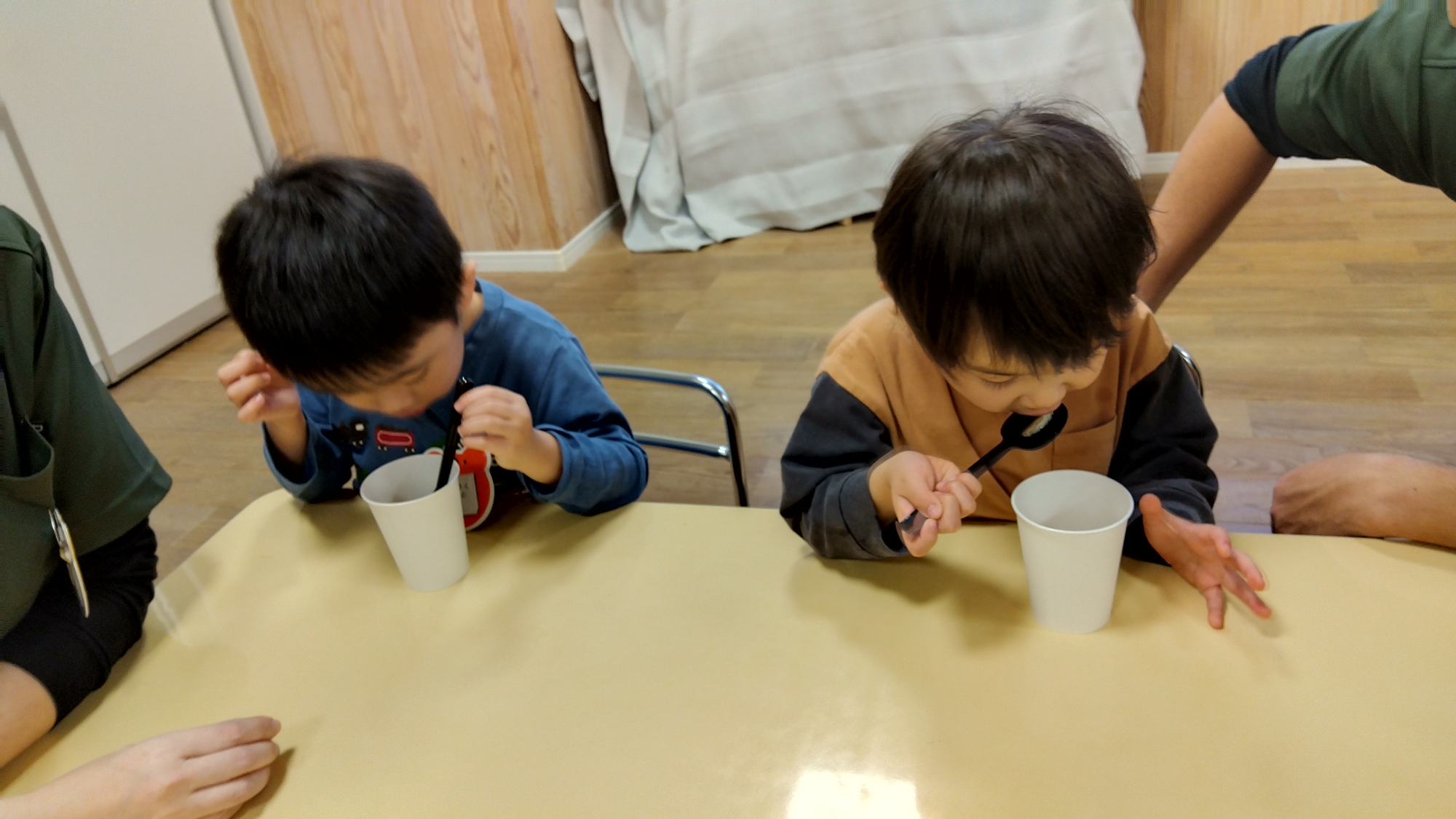 最後は、実際に調理したしいたけを食べてみます。今回は、水戻ししたしいたけをスープにして食べてみました。しいたけの香りが強いのでスープの匂いを嗅いだだけで顔をしかめるけれど、周りをみまわしてスプーンですくって口運んでみようとチャレンジする子や、しいたけは大好きだけれど、家で食べるしいたけとは違う形に驚いて口に運べない子、「おいしそう!」とすぐに完食してしまう子など一人一人違った反応がありました。