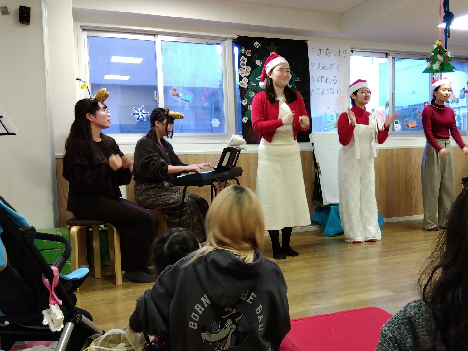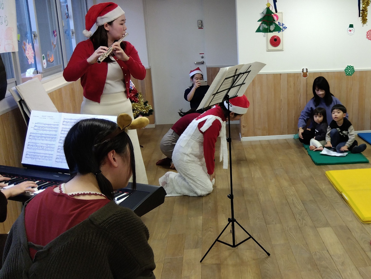発達支援つむぎ 目白ルームでは12月10日、13日にクリスマス音楽会を開催しました。ホンモノに触れる機会作りとして年度当初に計画し、今回縁あって豊島区にある東京音楽大学(池袋キャンパス)から6名の学生の方々が来てくださいました。