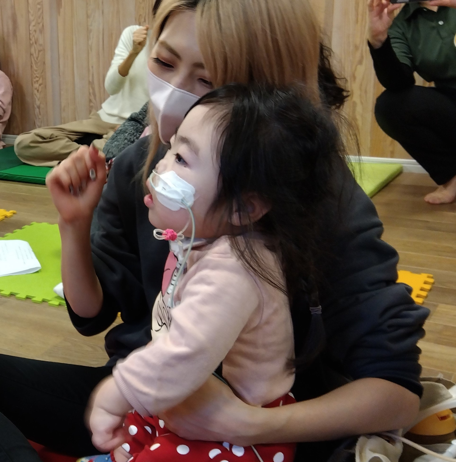 今回の音楽会では、参加する子どもたちはもちろん、保護者の方も安心して楽しめるようにパーテーションを開けて室内を広げたり、座っても寝転んでも大型バギーでの入室も容易にできるように床にマットを敷いたり、参加者全員が自由に過ごせるような環境づくりを行いました。吸引が必要な子どもも、バギーを室内に置くことができたのでいつでも状況に合わせて吸引をすることができ、マットの上で座ったり保護者の方に寄りかかったりしながら、音楽に合わせて腕を動かして楽しんでいる様子がありました。それぞれ自由なスタイルで参加することで、のびのびと音楽を感じているようでした。