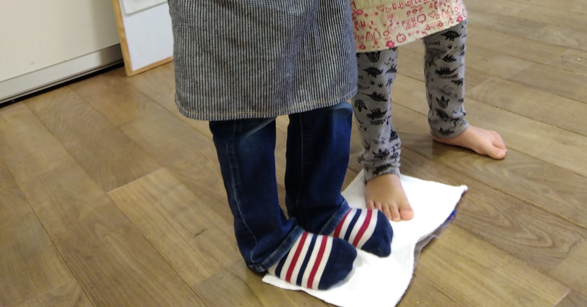 次はうどん特有のコシを出すために、袋にいれたうどん団子を踏みつけます。順番を待ち切れず、つい片足をのせてしまう子もいました。