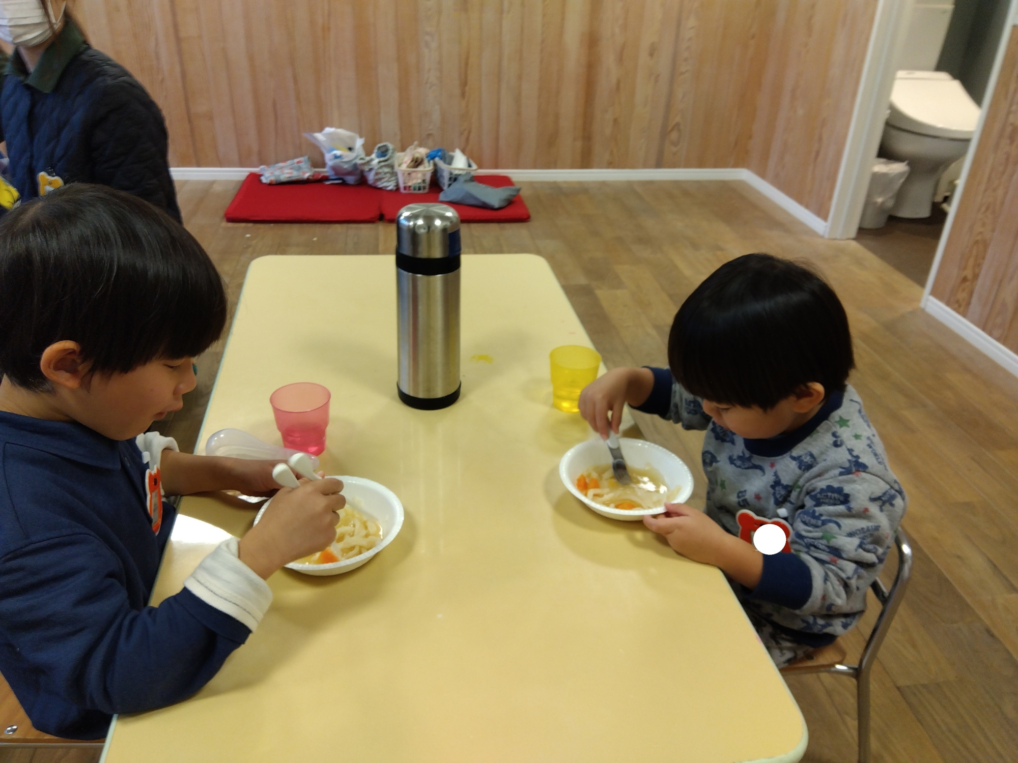 今年のうどんのスープは、ニンジン、ジャガイモを使って野菜出汁を取ることにしました。ゆであがったうどんを入れて、いよいよ実食です。子どもたちは、嫌いな野菜と言いながら口に入れてみたり、お代わりをしたりと“ジブンで作った”うどんを思い思いに楽しんでいました。