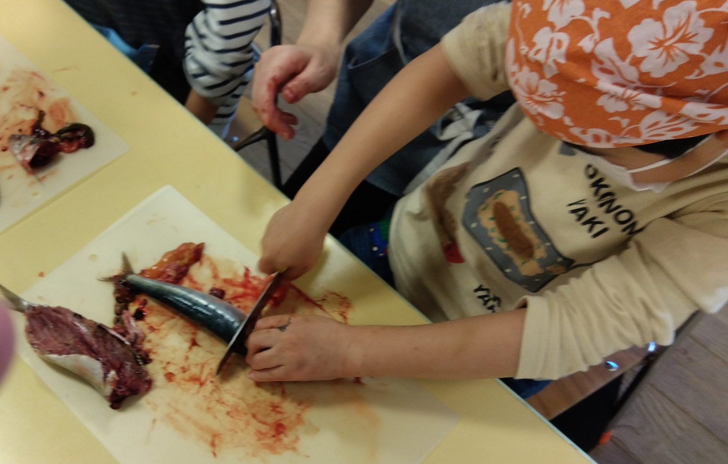 イワシを選んだ子の一人は、スタッフの見本をみて、一人で包丁を使ってイワシの頭を落とし、内臓を取り、手開きをして完成させていました。