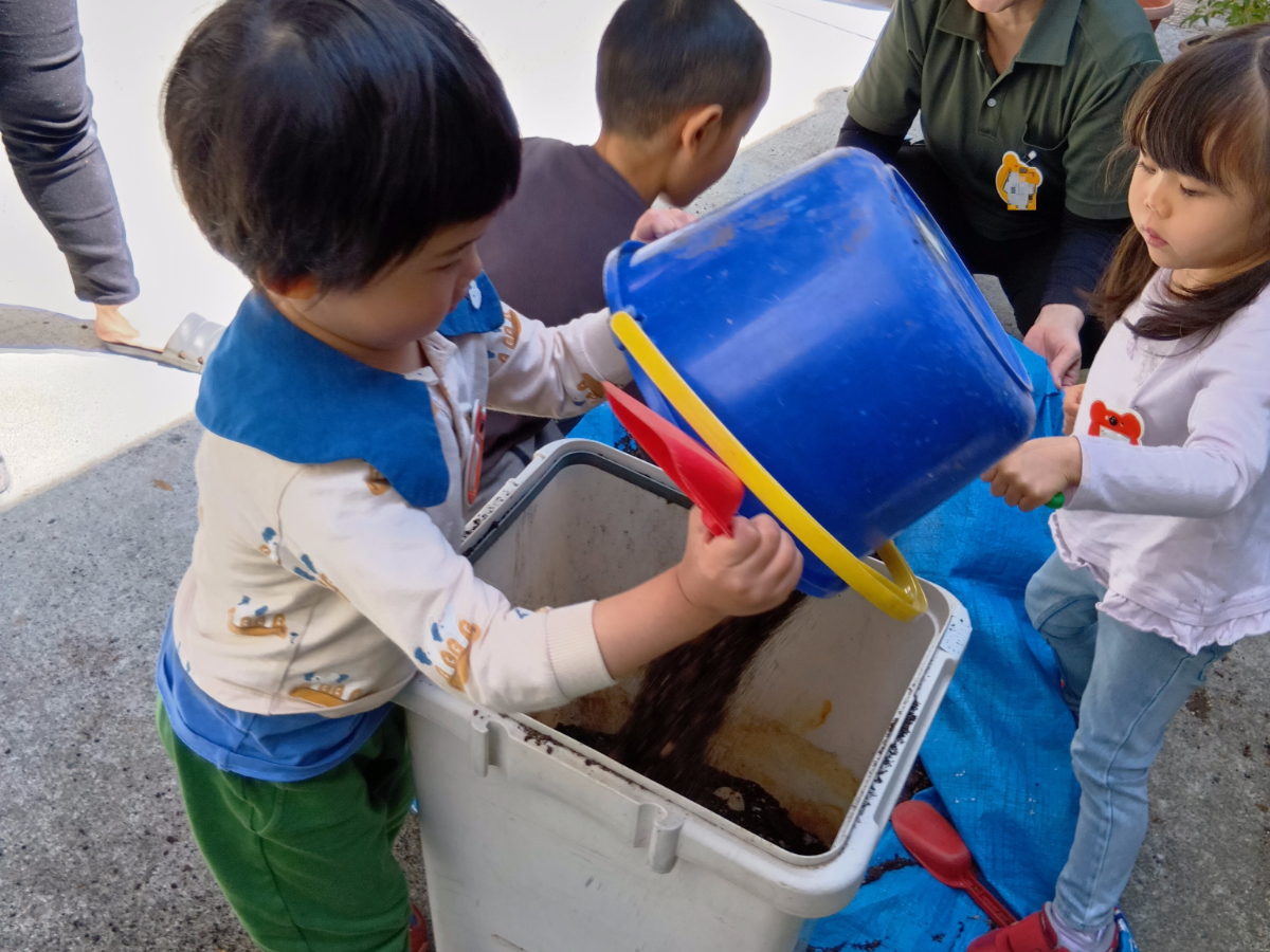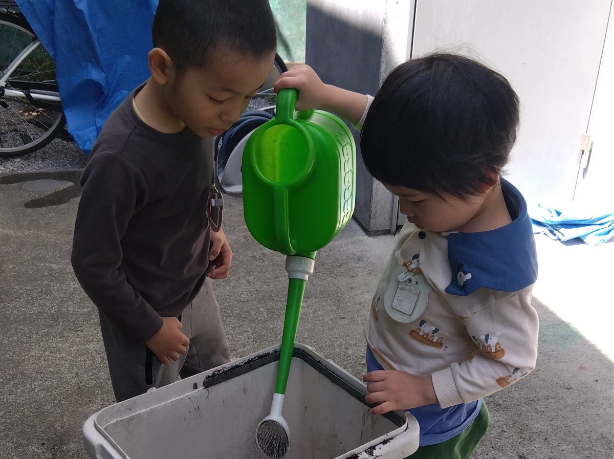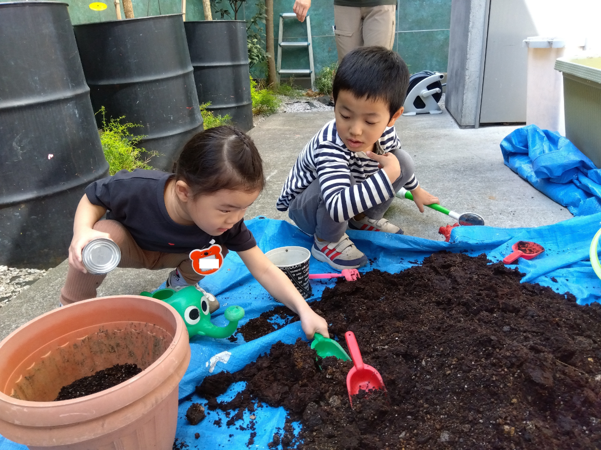 まずは、土つくりから始めます。シャベルで土を広げ、ごみや石を取り除きます。一週間ほど太陽に当てます。ふわふわになった土を縦長のプランターに入れ、種芋を等間隔で埋めていきます。最後は水やりをして完成です。土の感触はやや湿っぽく、手のひらが汚れたり、爪の間に土が入ってしまったりなど砂場の砂とは違う感触を子どもたちは楽しむことができました。土の中から、ダンゴムシやミミズなどを見つけると、子どもたちは顔を近づけたり、シャベルで触ってみたりしていました。