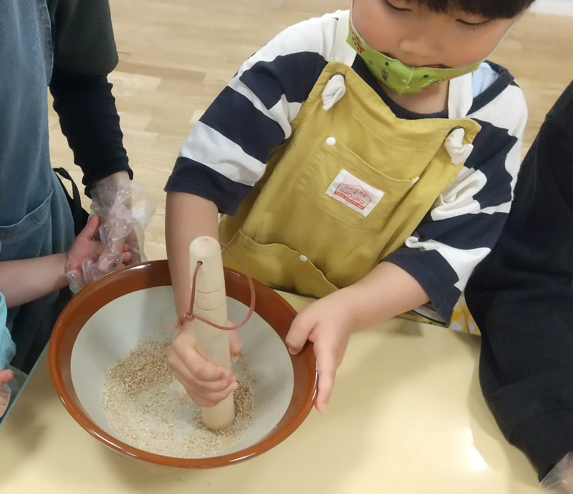 胡麻はすり鉢で擂ります。香りが漂ってくると「いいにおい!」と近づいて香りを楽しみながら擂っていました。