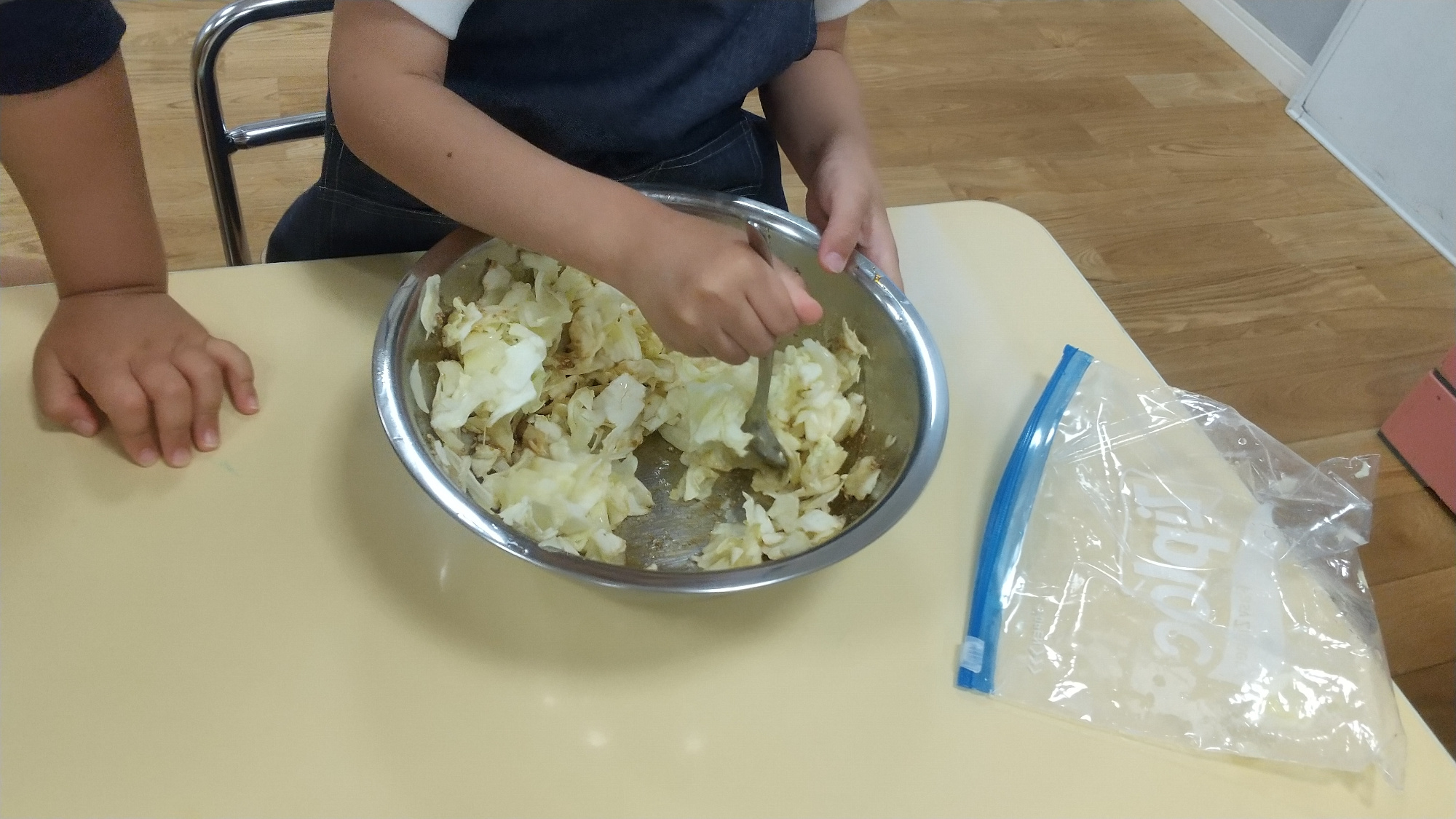キャベツを食べたことがない子も自分で作って工程を知ることで、挑戦して一口食べている子や完食している子がいました。「すごい!食べたの?」とお母さんに褒められて嬉しそうにしている様子が見られ、食べられるメニューが増える機会になったと思います。