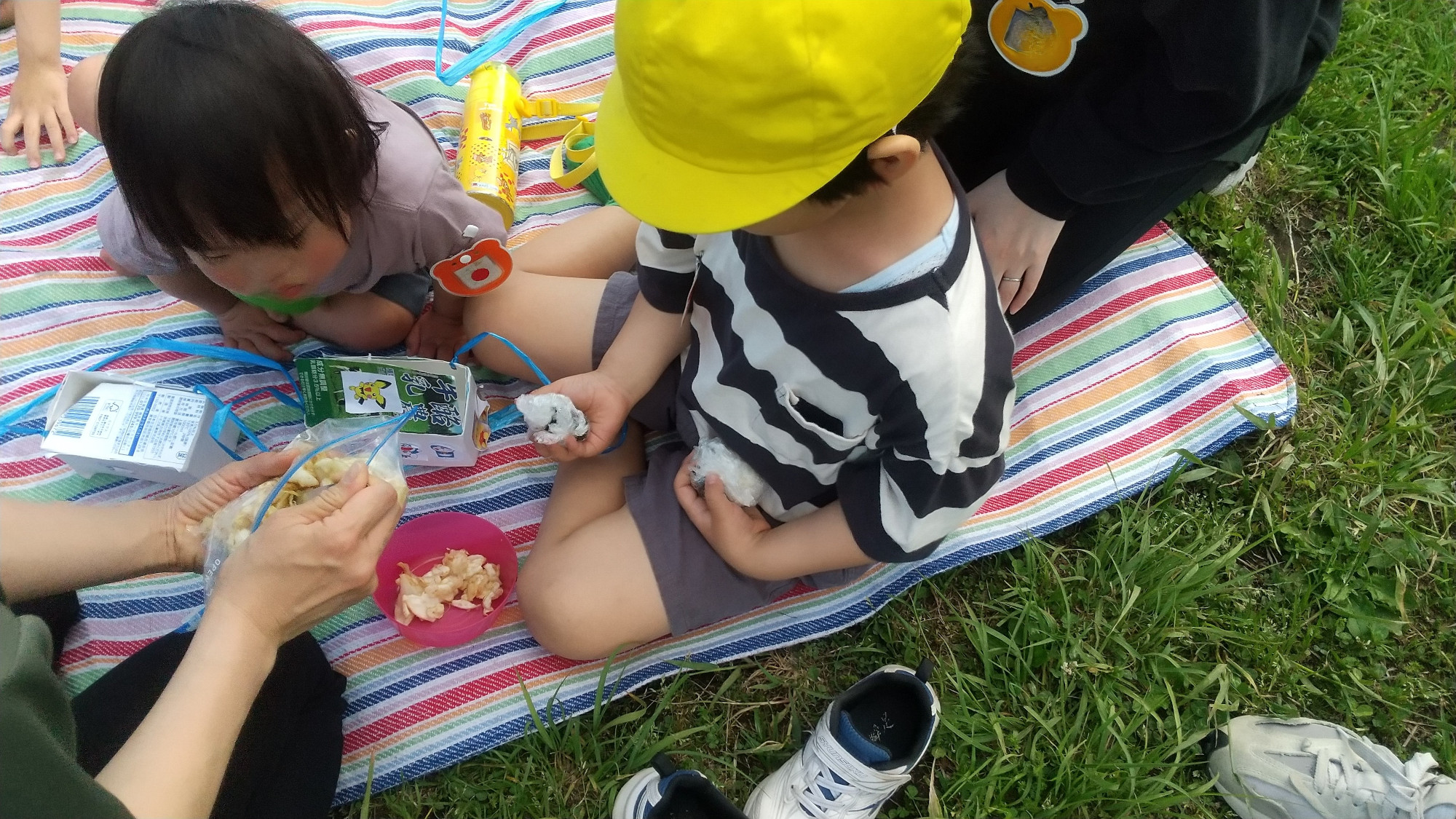 完成したおにぎりは自分で作った紙パックの弁当箱に入れて公園に出発です。キャベツの胡麻和えはお皿に食べられる分だけ入れて、シートを敷いてみんなとお母さんたちと青空の下でいただきました。