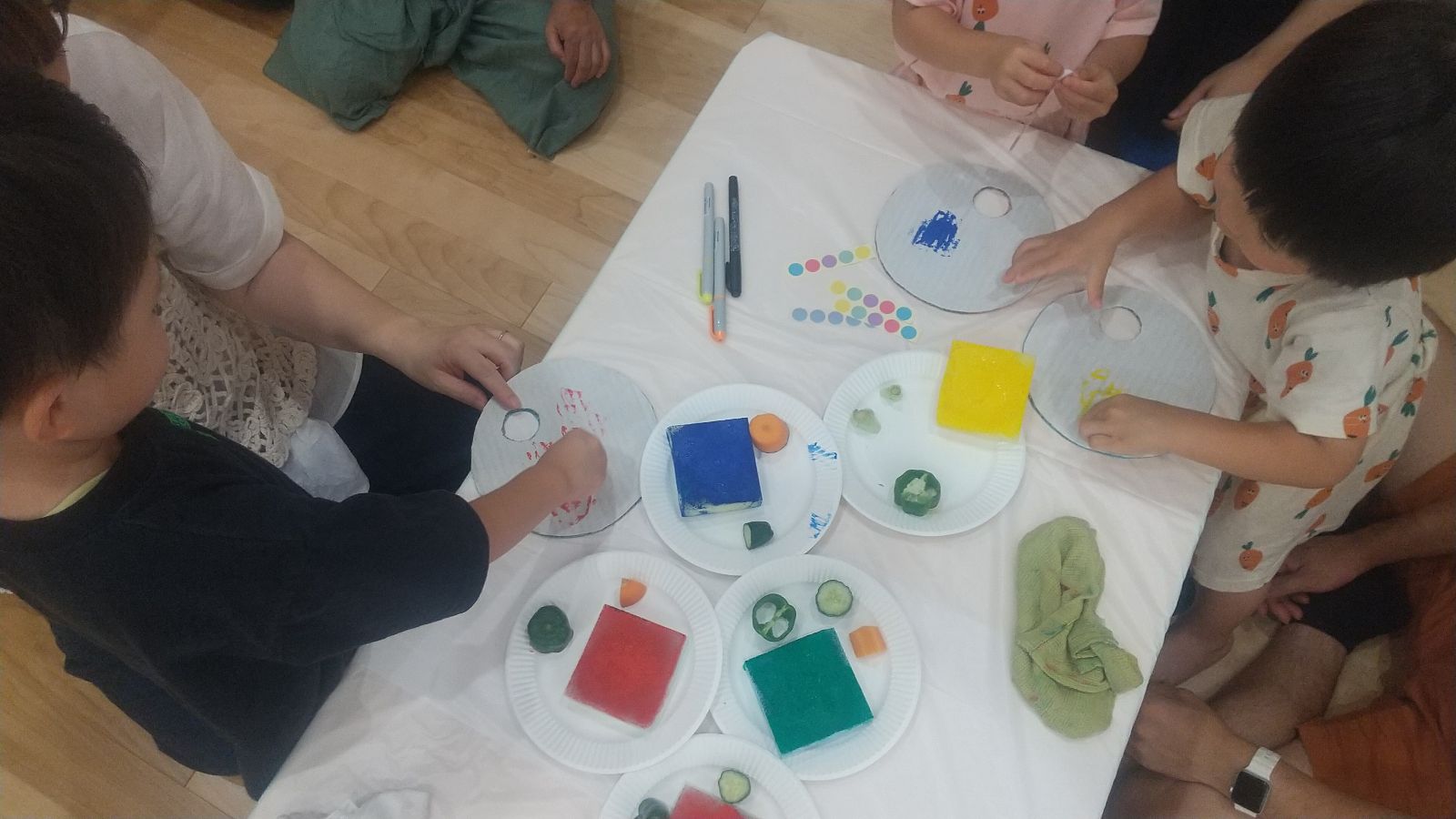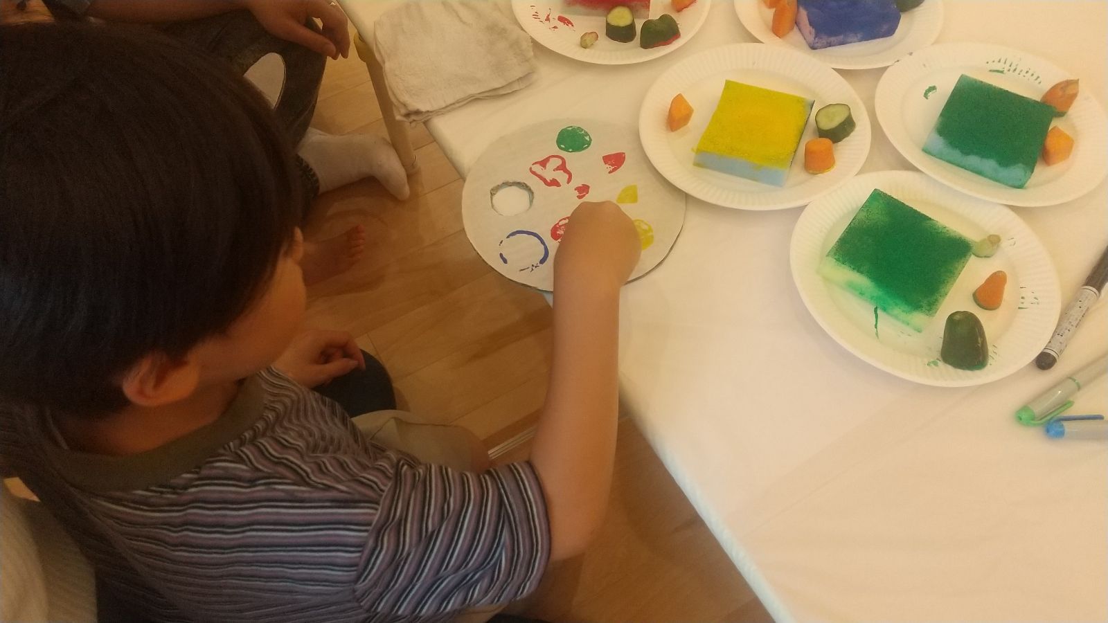 うちわには野菜の切れ端を使ったスタンプで模様を付けていきます。野菜は、にんじん、ピーマン、きゅうり、小松菜を使いました。毎日の食事の中で食べている野菜に絵の具を付けて模様を付けていくと色々な形をスタンプできます。どの野菜を使うか、どの色を使うか自分で考えるだけでなく、家族と一緒に話し合ったり、隣の友だちの作ったものを見たりしながらすすめていきました。