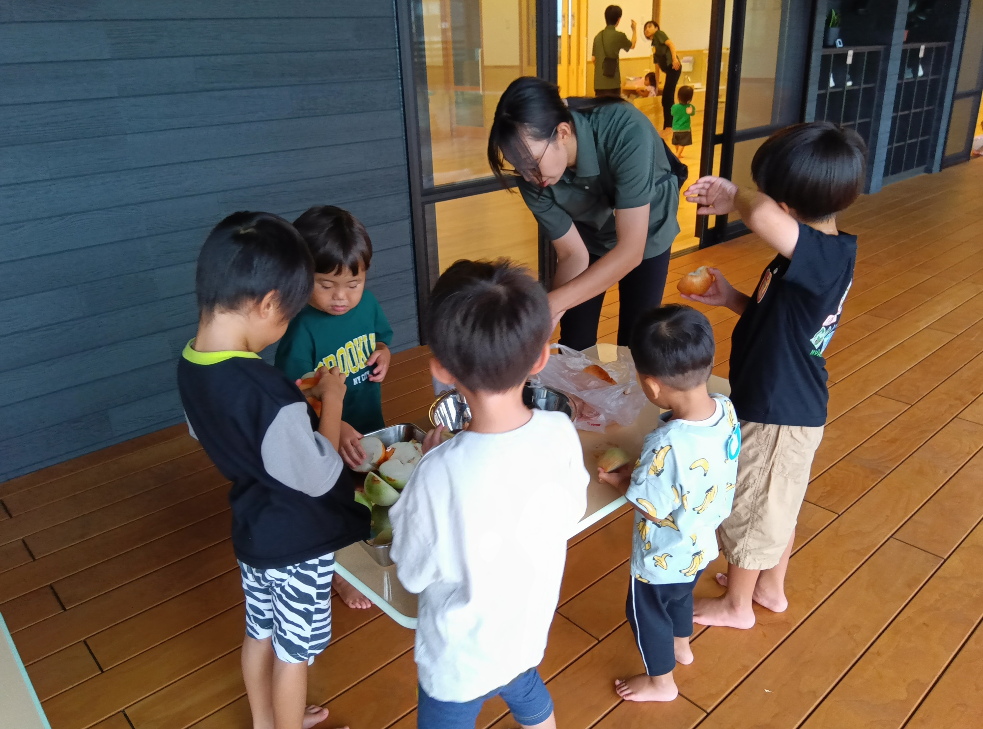 まずは野菜の皮むきです。園では毎日給食に使用する野菜の下ごしらえをしています。この日は玉ねぎの皮をむいている所です。縁側に机が出るとワクワクした様子で近づいて来ます。