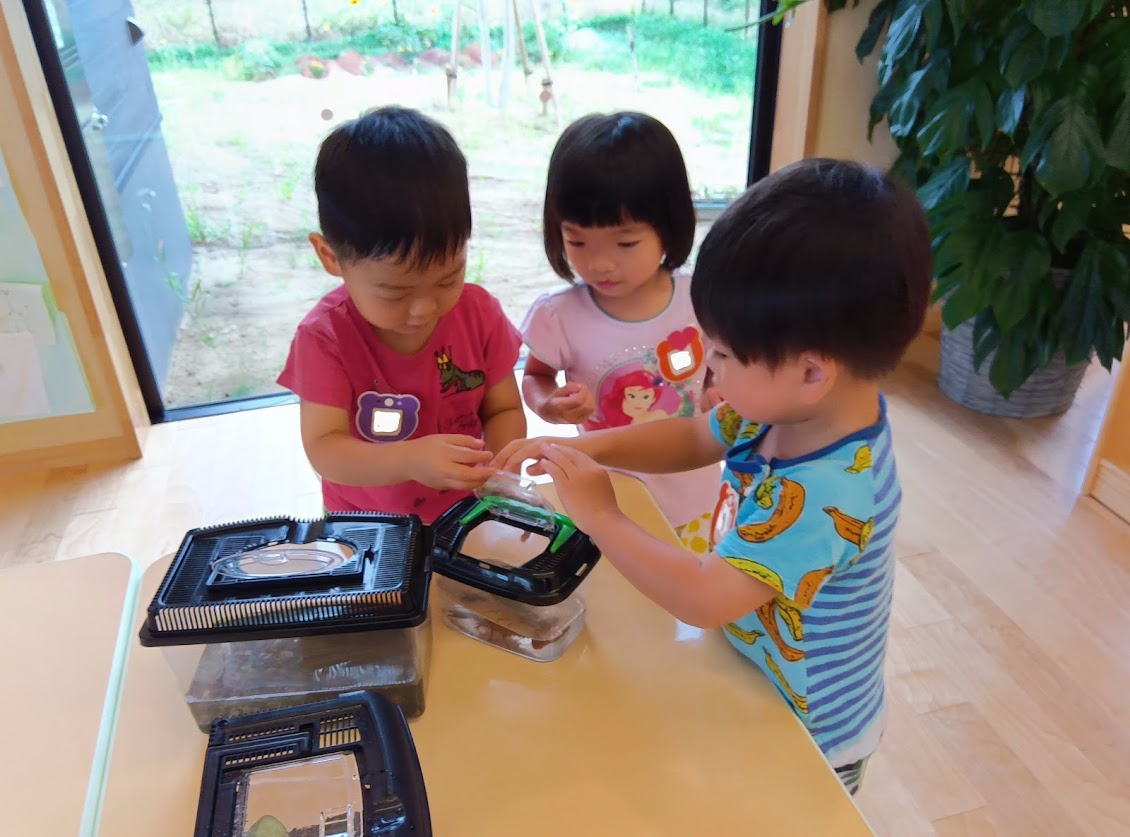 そして生き物の世話もあります。登園のたびに元気か確認し、餌やりや、水槽・虫かごの掃除、きりふきをしてくれています。春は興味が向かなかった子もいましたが、今は気にかけて朝一番に水槽を覗きに来てくれます。