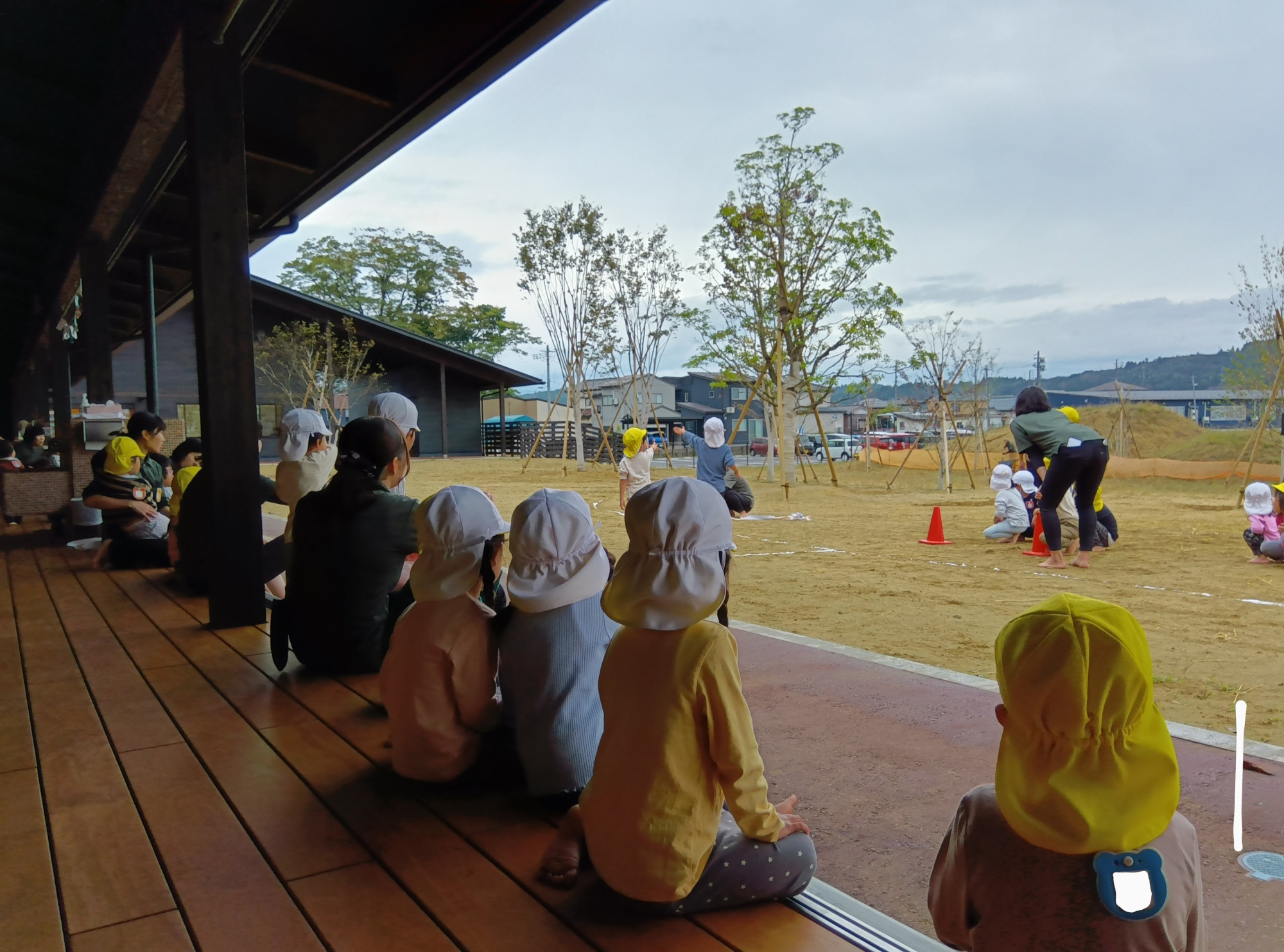 次は併設の見附どろんこ保育園のはじめての運動会です。バトンを持って走るリレーにも挑戦しました。コースをしっかり見ながら走ったり、次の友だちにバトンを落とさずに渡したり。日々楽しみながら走り方、バトンの受け渡しも上手になりました。