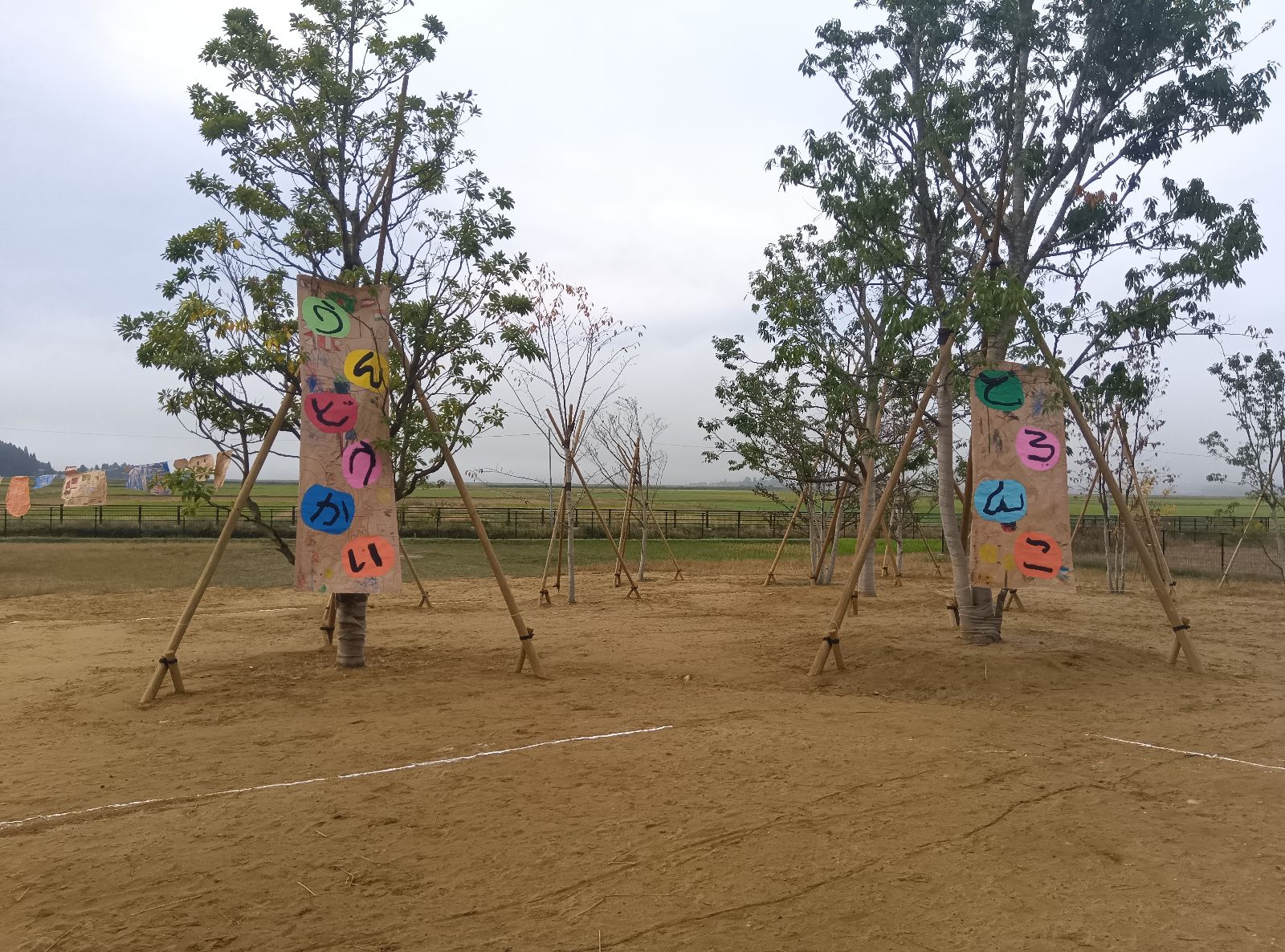 世界にひとつだけの手作り万国旗と看板です。当日は子どもたちのはじめての運動会を華やかに彩り、そしてあたたかく空から見守ってくれていました。