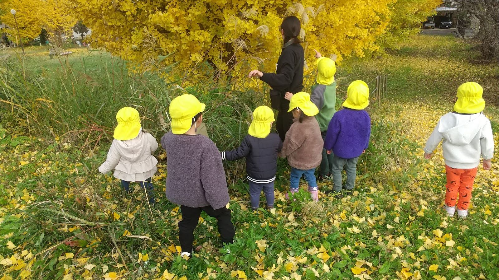 また、散歩で行く公園には大きなイチョウの木があります。木の下にはイチョウの黄色い絨毯が広がっており、木の根元に集まった子どもたちは、イチョウの葉を拾ったり、虫探しに夢中になりました。