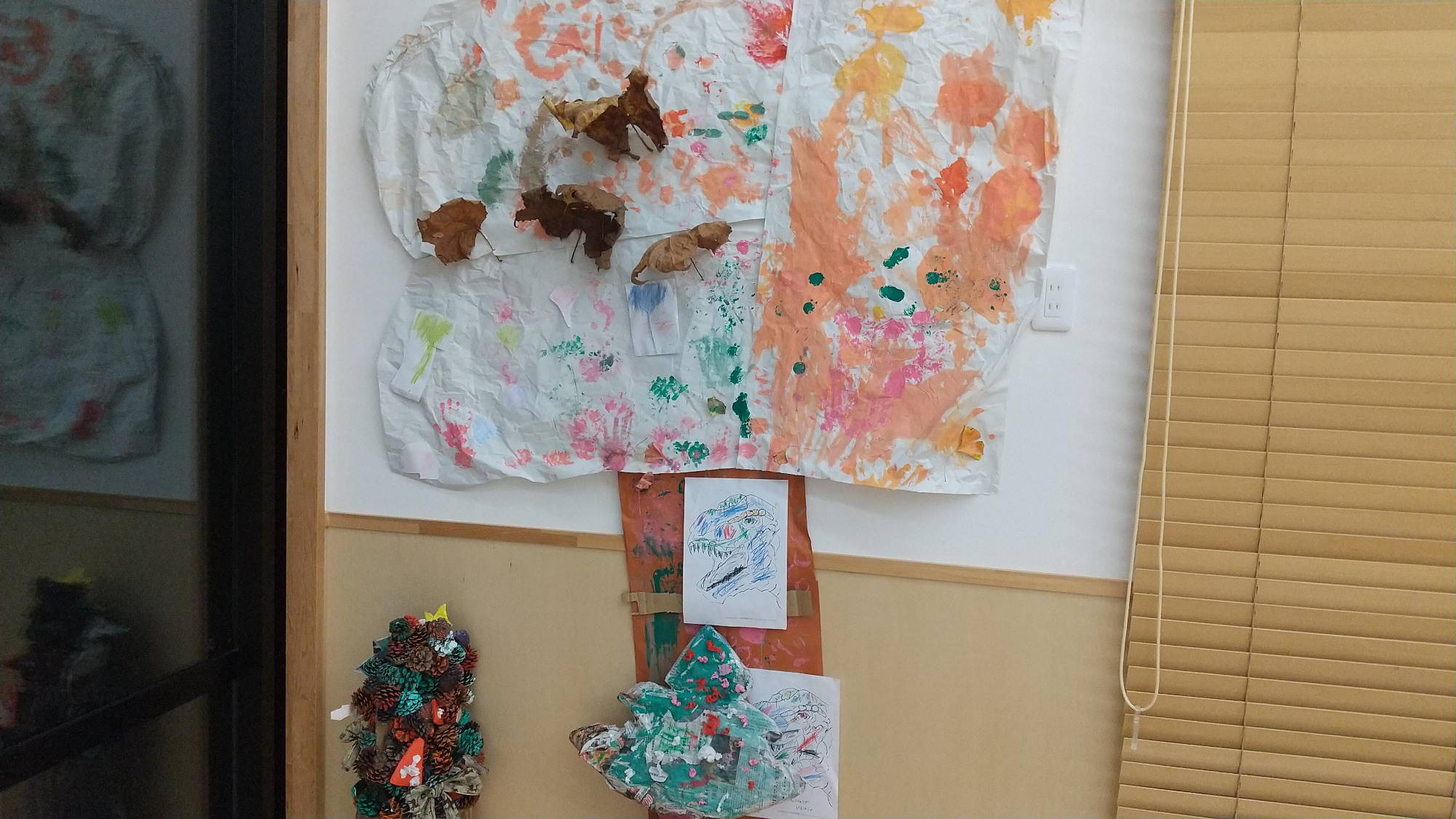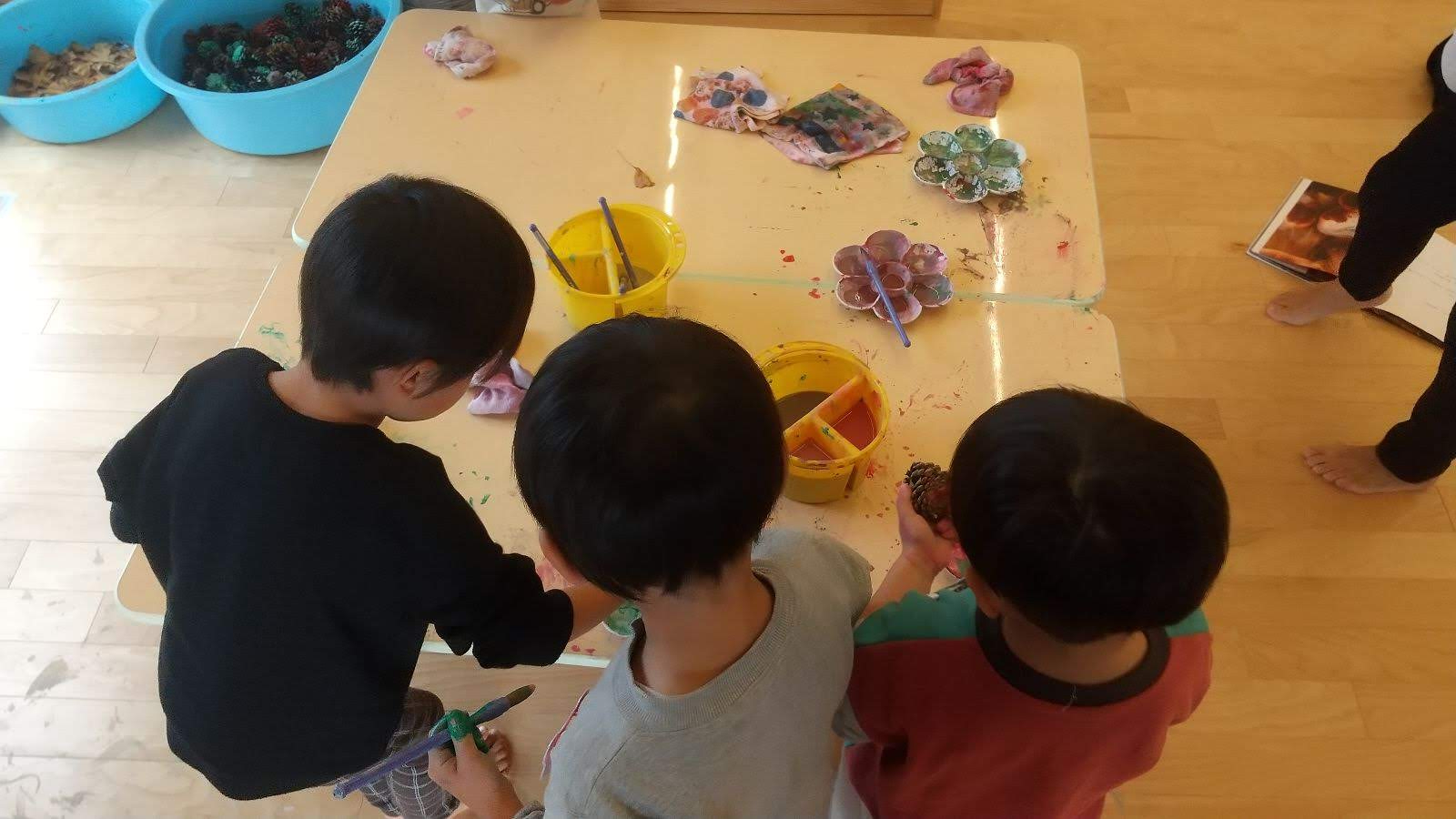 保育園に戻ると、散歩で見つけてきた秋の宝物を使って、製作活動を行います。拾ってきたイチョウの葉や自分たちの手に絵の具を塗ってスタンプをしたり、筆で色を塗って公園で見てきたイチョウの木を作り上げました。また、イチョウの木と一緒にクリスマスツリーの製作も行います。子どもたちは松ぼっくりに思い思いの絵の具で色を塗り、個性あふれる素敵なツリーの完成です。