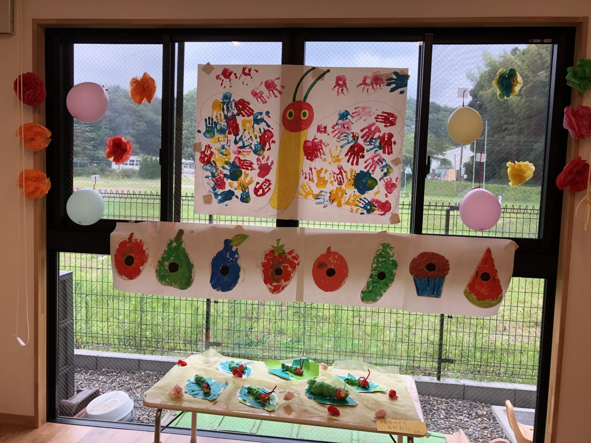 まずは「つむぎギャラリー」。3日間連続で制作した「はらぺこあおむし」です。個性豊かな可愛いあおむし達やみんなで協力してスタンピングをした食べ物。そしてたくさんの手形であざやかな蝶々が出来ました!