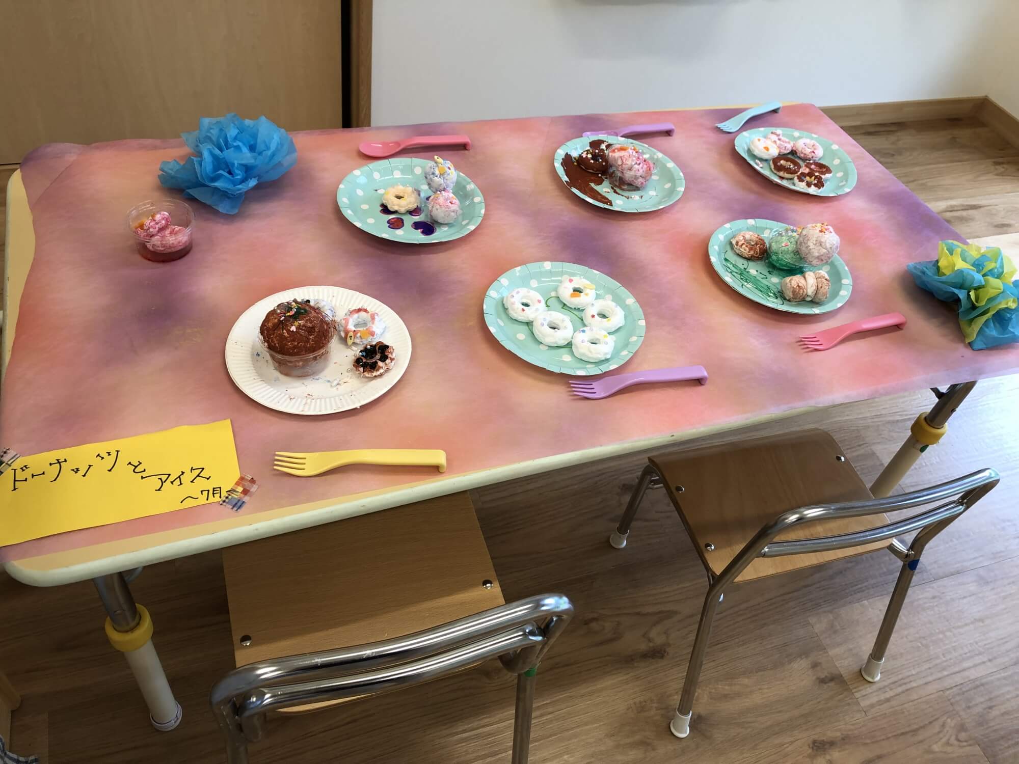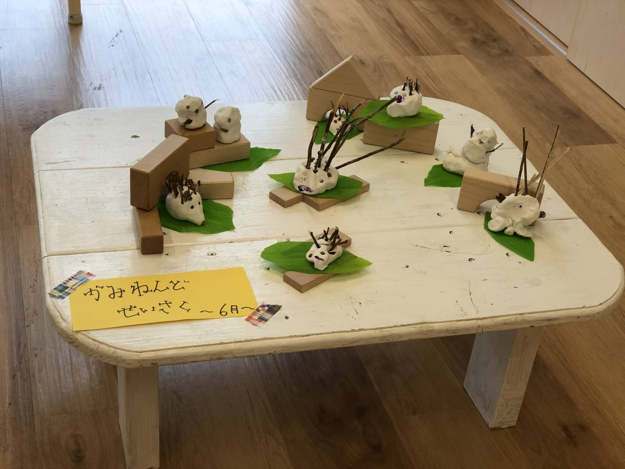 硬い紙粘土と軽くてやわらかい紙粘土など、異なる感触を楽しみながらつくった粘土制作。硬い粘土とお散歩で拾った自然物を使い、はりねずみや雪だるまなど様々な物が出来ました。やわらかい紙粘土は、型抜きをしてドーナッツやアイスなどの美味しそうなデザートに!