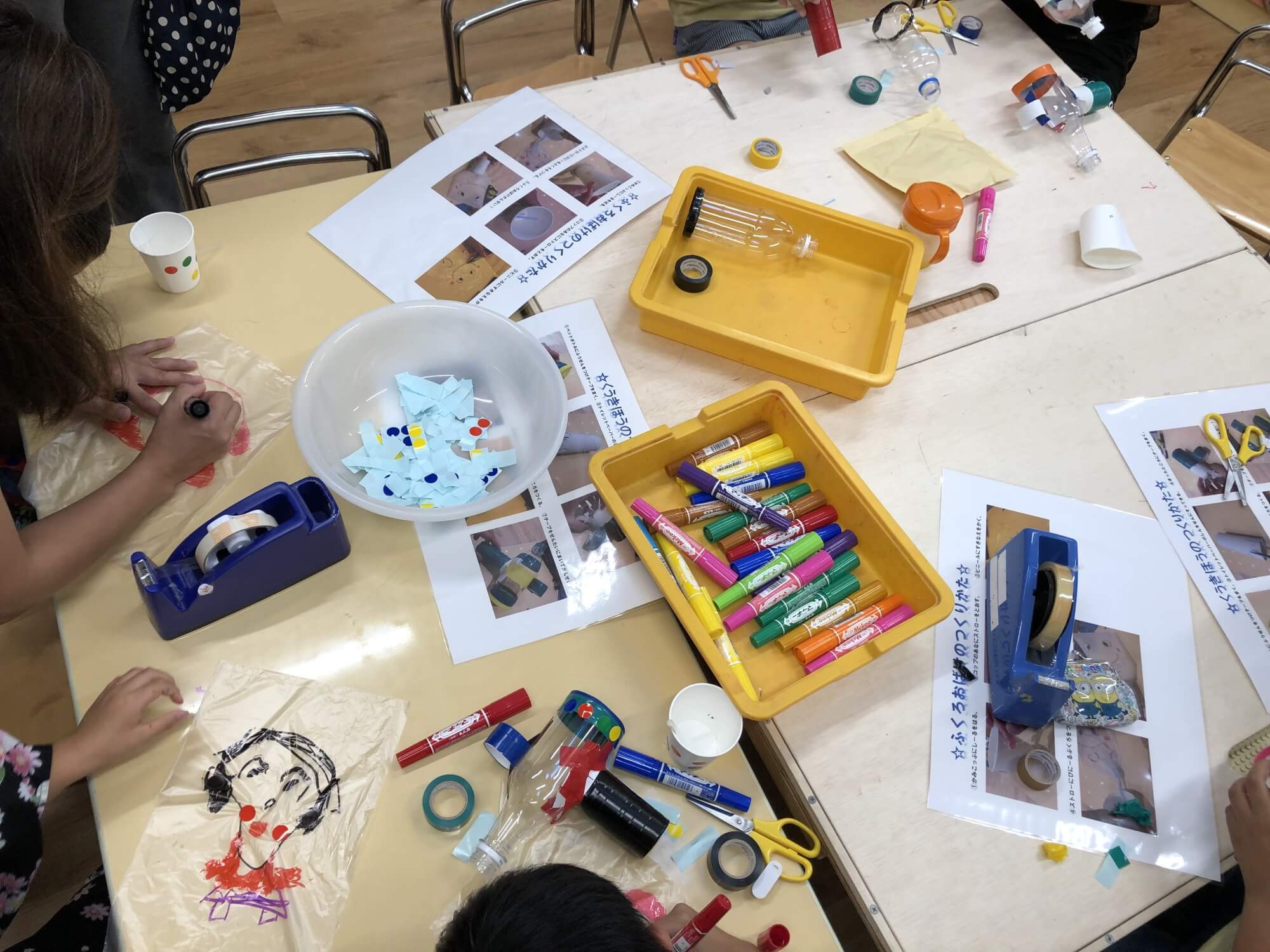 「これ作ったんだよ」と、自分の作ったものをお母さんやお父さんに嬉しそうに話をしている姿がたくさん見られました。「廃材を使った制作コーナー」では、ペットボトルの空気砲と、紙コップと袋を使って膨らませるおもちゃの2種類を用意してゾーン展開しました!