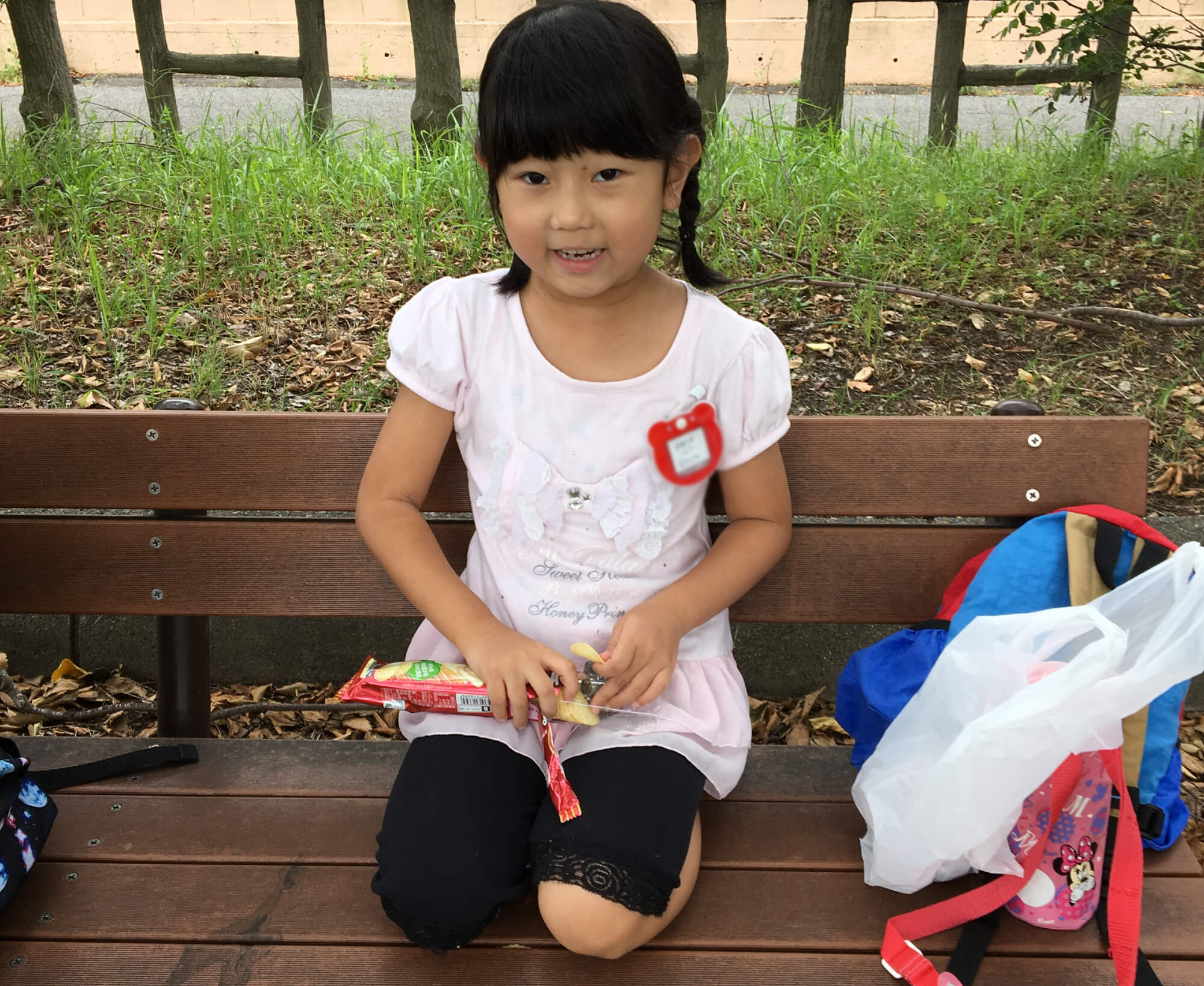お買い物を終え、お友だちと手をつなぎ、近くの公園へ歩いて行きます。好きな遊具で遊んだ後は、ベンチに座ってお楽しみのおやつタイム!それぞれ、買ったお菓子を見せ合っこしながら、「おいしいね」「せんせいにもあげる」とうれしそうでした。