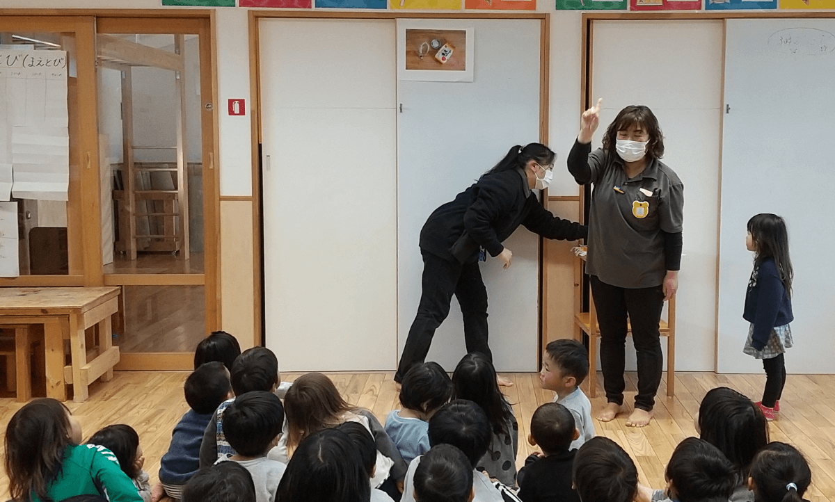 まずは、うどんの材料や作り方の話をみんなで聞きます。「うどんは何でできているんだっけ?」「どうやって作るのかな?」などの質問に答えながら、子どもたちは興味深く話を聞いています。