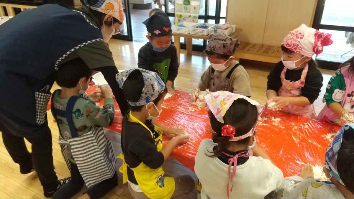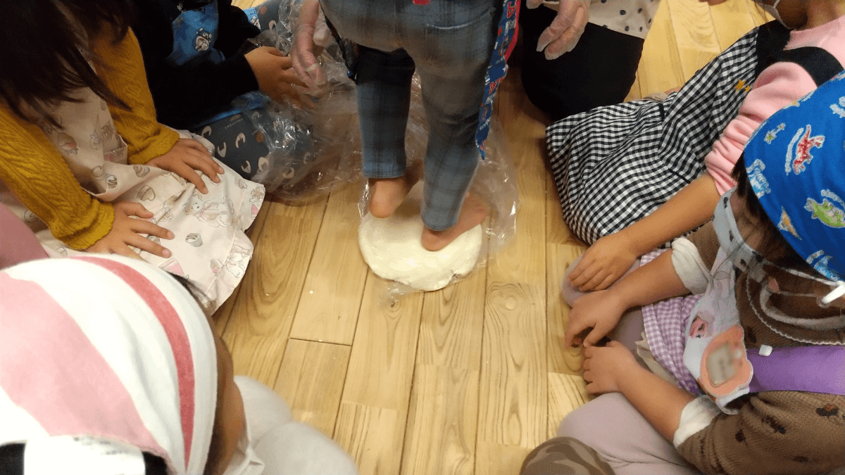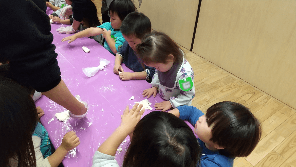 2歳児も、積極的に参加しました。一生懸命こねていくと、べたべたした感触から徐々に固まっていく様子を目で感じ、手でも感じることができました。