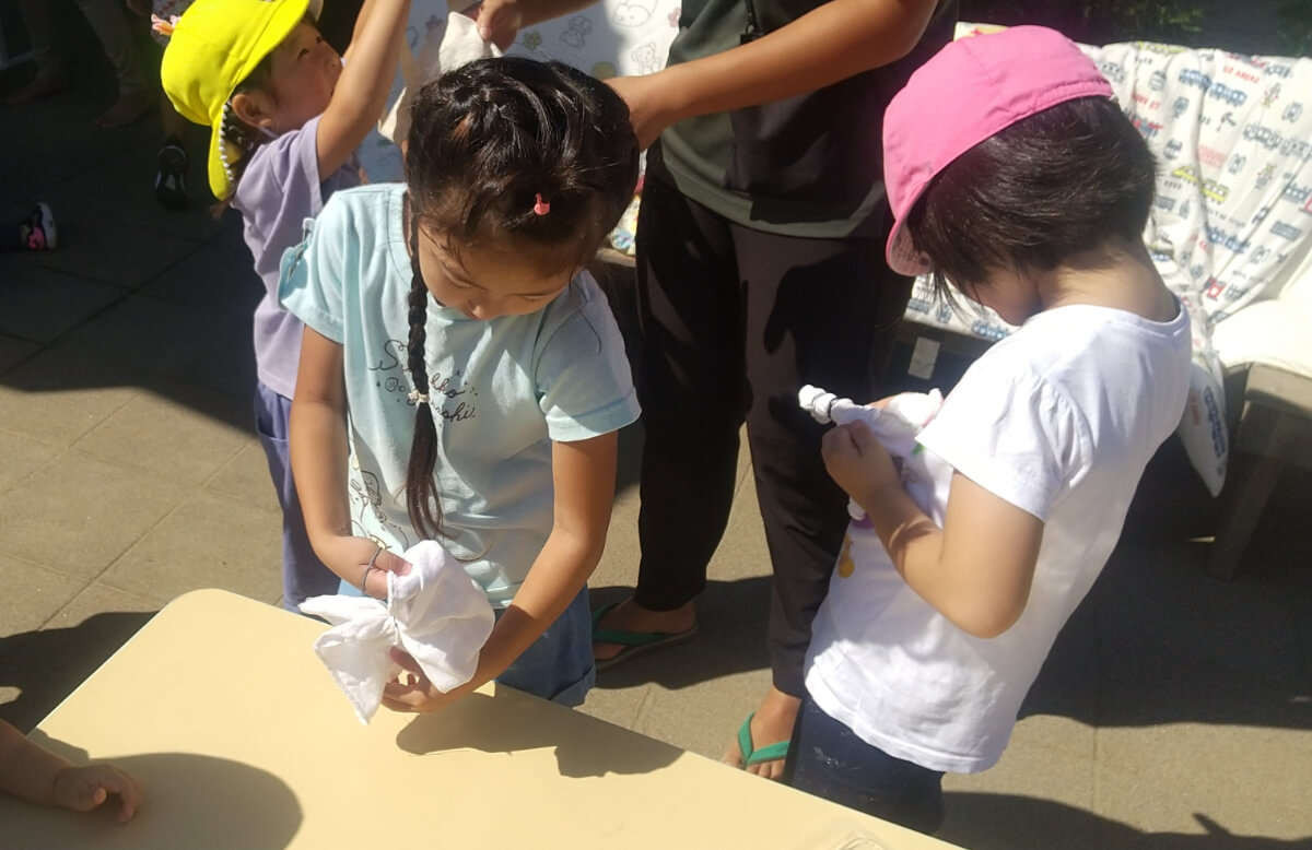 次に、模様づけを行います。ペットボトルのキャップ、割りばしを輪ゴムで巻きつけていくと、その部分は染まらずに白い模様になります。「輪ゴム難しいよ」と言いながらも、自分でやってみようとする子が多く、できない部分はスタッフと一緒に行いました。