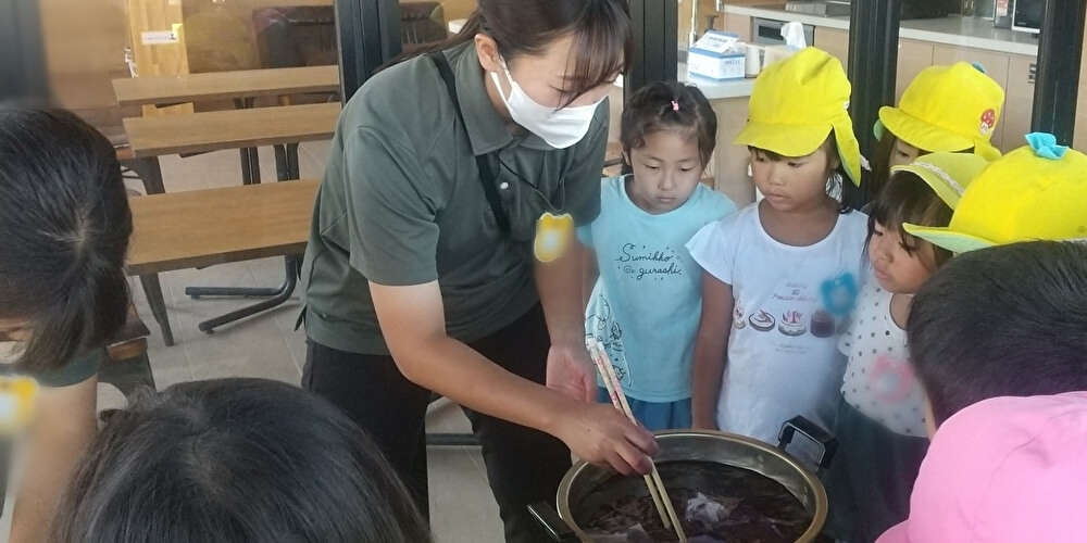 模様づけの後は、採り溜めていた花と葉を煮出していきます。「なんか甘い匂いがする」「青色だね」「紫色だよ」と濃くなっていく色味をじっくり観察していました。続いて、色を鮮やかにするための酢を入れます。「わぁ、綺麗な色だね」「ピンク色に変わったよ」と色の変化に気づき、驚く姿がありました。