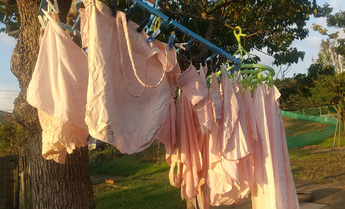 布がきれいなピンク色に染まると、子どもたちは早く模様が見たい様子で、模様づけに使った輪ゴムを夢中ではずしていました。白い丸い模様がくっきり出た子や想像より線がつかずに残念そうにする子もいましたが、自分で作った作品に対して愛着を感じていました。今回、子どもたちが自分で育てた花や葉を使って染め物を行うことで、自然物への興味が高まり、自然な色彩を感じる経験となりました。