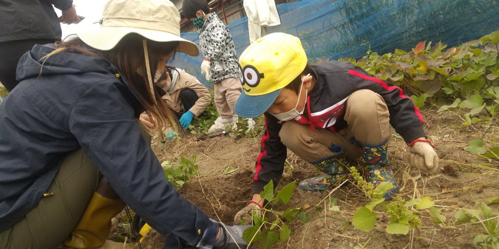 「あ、見えてきたよ」「お芋の頭かな?お尻かな?」芋を傷つけないように芋の形を確認しながら優しく堀ります。
