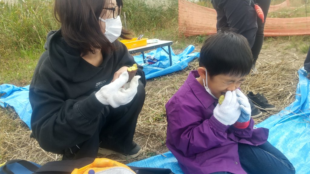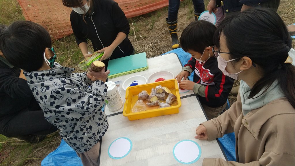 メダル作りが終わった後は、焼きたての焼き芋を食べます。「ほくほくだね、こんなに甘いお芋初めてだね」と食を楽しみ合う親子の姿が多く見られました。保護者の方々から「普段家では食べないのに今日は美味しそうに食べていて、嬉しいです」とのお話があり、保護者や友だちと一緒に、自分で掘った芋をその場で食べる経験が、食の広がりにつながったのかなと感じました。子どもの「食べたい気持ち」を今後も大切にしていきたいと思います。