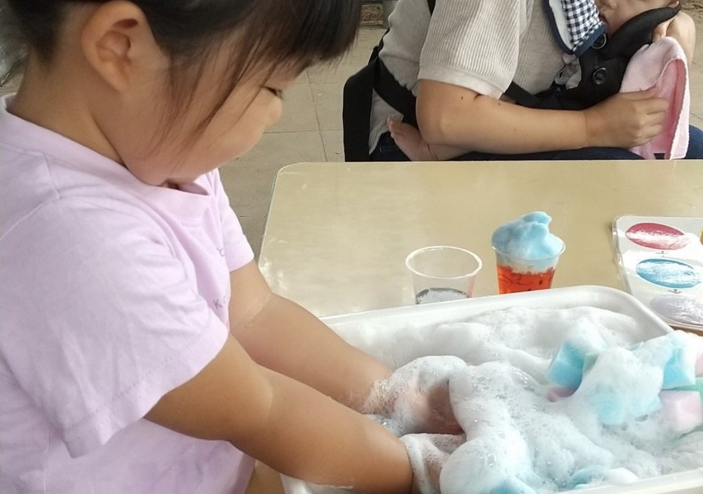 夏には、ボディペイント・色水遊び・泡遊び等全身を使って感触遊びを楽しみました。