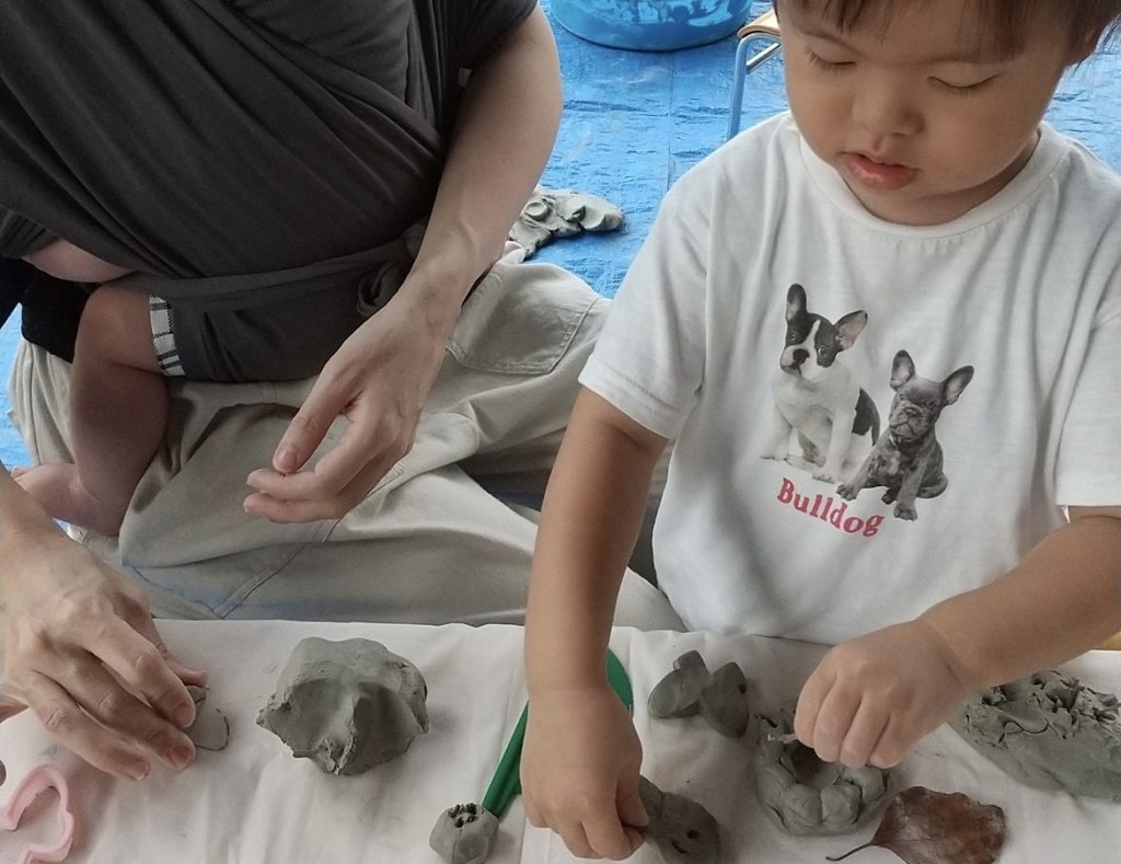 秋には、園庭に落ちている葉っぱや木の枝と土粘土を組み合わせて表現遊びを楽しみました。素材から季節を感じ、じっくりと親子で遊びます。粘土遊びを通して「握る」「こねる」「つまむ」「丸める」「転がす」「たたく」など、 様々な手指の動きを経験する中で、手先の発達につながっていきます。