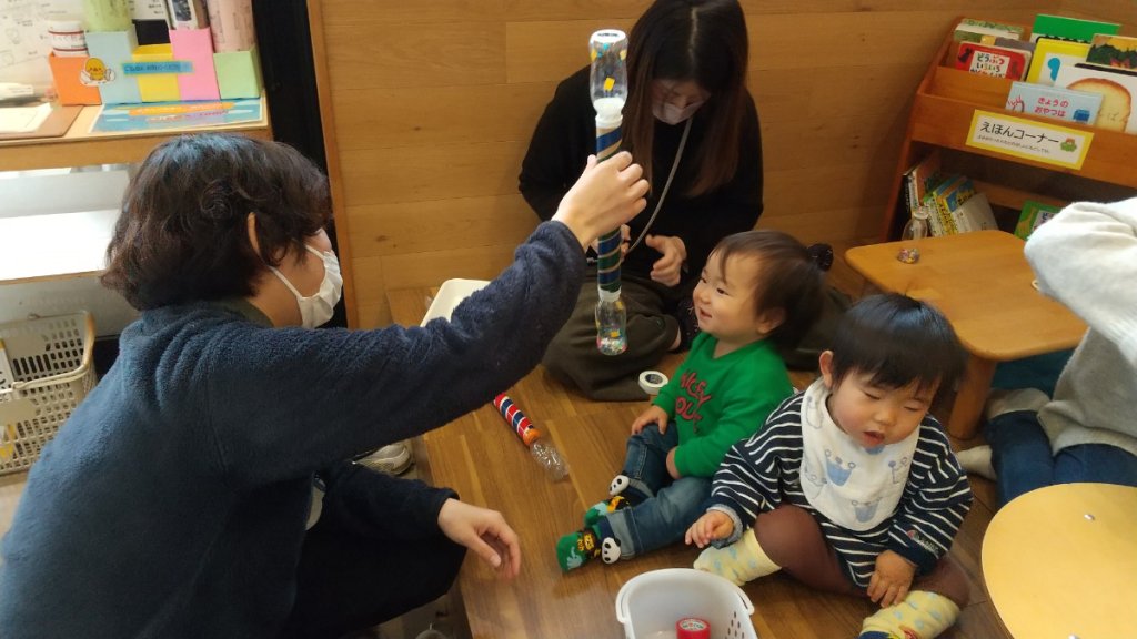 後半は、作ってすぐに遊べる「センサリーボトル」と「ペットボトルシェイカー」二種類のおもちゃ作りを行いまいした。「センサリーボトル」はゆっくりとボトルの中でビーズ等のパーツが落ちていくのを眺めることで、子どもはもちろん大人にとってもリラックス効果があります。「ペットボトルシェイカー」はペットボトルとラップの芯を使用し、掴んで音を鳴らすだけでなく、転がして視覚的にも楽しむことができるよう工夫しました。
