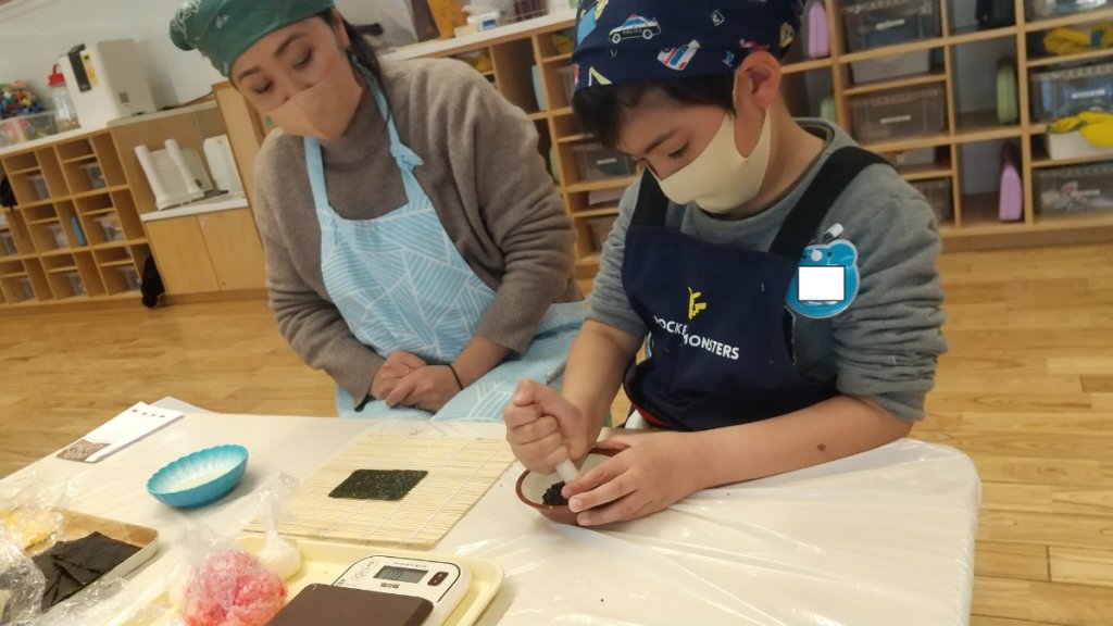 それから一つ一つのパーツを組み合わせていきます。完成までの工程がご飯をのばして、巻いての繰り返しということもあり「まだ巻くの」など途中で飽きてしまう場面も見られました。お母さんに励まされながら、今やっている工程から作り終えるまでの見通しをもつことで最後までやり遂げることができました。
