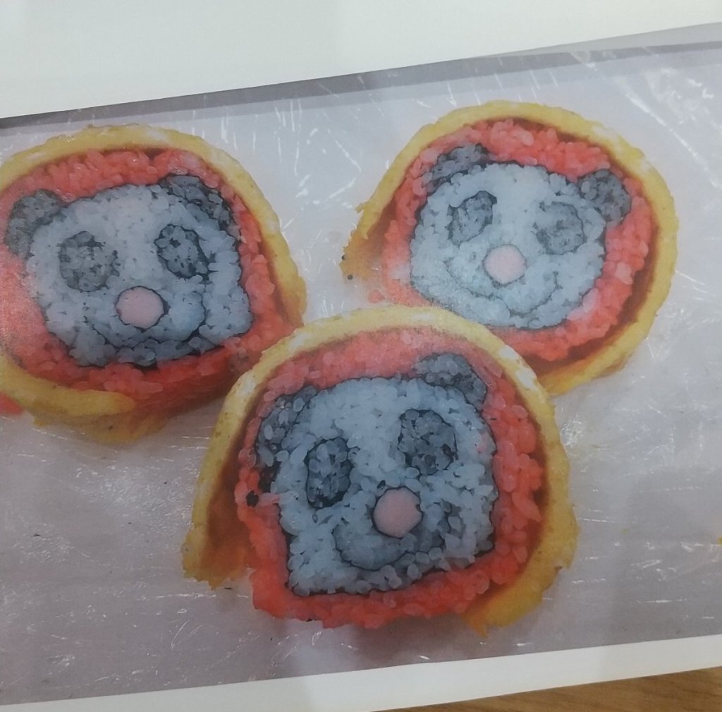 今回は「太巻き祭り寿司」です。太巻き祭り寿司は房総の郷土料理で、お祝い事や年中行事などのイベントに合わせて振る舞われていたものを、今回鴨川出身の保育者が知ってもらいたいと企画しました。桃の花・トンボ・カタツムリなどいろいろな図柄がありますが、誰もが親しみやすく気軽に作れる「パンダ」を選びました。