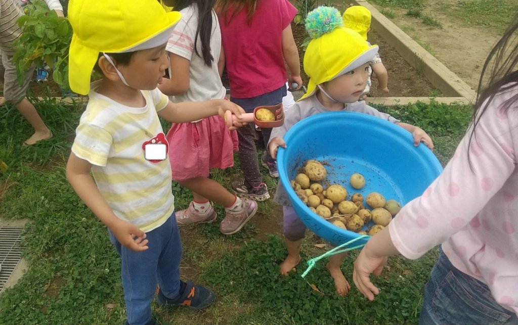 じゃがいもを育てていくにあたり、じゃがいもがどのようにできるのかの成長過程を一緒に学んでいきました。子どもたちからは「土の中にじゃがいもが出来るの」「こんなにたくさんなるのかな」などという声が聞かれ、収穫の日を心待ちにしている様子がありました。待ちに待った収穫では「手が汚れるから嫌だ」、「虫がいるから嫌だ」と言う子もいましたが、友達が収穫している様子見て参加することができたり、収穫した後のクッキングをするために挑戦したりと短時間の間で子どもたちの成長を感じることができました。